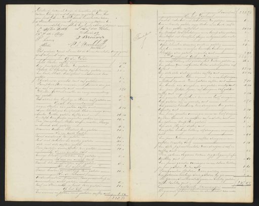 Transport ƒ 223 75 In het Voorsruis koechel, kolenbak met toebehooren zes gulden 6 twee en twintig gulden zegge stoelen en een bank, vyf te fels tien gulden vyftig cent 10 50 Een spiegel twee schilderijen en een lamp drie gulden Een Bafel met kooreften, glazen en sigaren, drie mater drie gulden 3 „ Ouderscheidene dranken veertien gulden 14 Lepels en vorken en messen beszeven boubier gereed „schappen drie gulden negentig cent 3 90 Ongemunt Gouden Zilverwerk 16 „ Een roode ketting met gouden slot zestien gulden Een zilveren Yzer met gouden boeken dertien gulden vrij 13 50 tig cent Een dito dito destien gulden vyftig cent 13 50 Een paar gouden billen wegende zes en en half decigren ƒ 1 5 achttien korraats Zeven gulden vyftien cent Een broeke vier decigroom vier gulden veertig cent 4 40 Een paar spelden / goud / vyf decigiam vierf gulden 5. 50 vyftig cent Een gouden hoofdplaat, twee en een half deegram twee gulden vyf en zeventig cent Een gouden houwing twee deugran twee gulden twintig cent - 2 20 Een paar gouden vorringen een en een half decigrant 1 36 veertien boraat een gulden vyf en dertig cent Een zilveren knip twee gulden Een dito flacon dertig cent Een zilver horloge ketting elf deegram negentien cent „ 9 Een paar zilveren gespen vyftien decigram een gulden twintig cent Een dito pypuithaalder zeven decigram vyf en vyftig cent Twee zilveren sigaren koken zegge sigaren pypen tachtig cent „ 80 Een paar gouden overringen en een zilver Kettin 1 60 je een gulden Zestig cent Twee gouden spelden Zeven gulden — Een zilveren hortoge drie gulden by gis se zamen drie honderd zeven en veertig gulden vyf en tachtig cent 3 47 85 Contante penningen De gereede gelden thans in den boedel aan mezig „liteiten de toeziende voogd, de tauxateur, die allen my Notaris bekend zyn met de getuigen zynde Jan Louis Jarel „zoon fonds bode en Jan Brouwes broodbakker nonen „de Haarlem mesmeer als getuigen en my Notaris be= „kend onmiddelyk na geheele voorlezing alhier geteeken C wes ten hoven L van der Helm J. Lems, etc. P I die Hoog J Brouwer Laan J S „ V. I. Broekhof Mitsen Notaris Dit gedaan zynde is men tot de Inventarisatie overgegaan op de volgende wyze — Op den Zolder Acht stoelen vyftig cent „ 50 twee poortytjes Erwten zes gulden Tabak en klompen vyf en twintig gulden 25 „ Een kast, sleede, brandhout en aardewerk twee gulden Kleederen in gemelde kort vyf gulden Parapluie twee manden met glaswerk drie gul den vyf en zeventig cent E. 3 75 Kleeden, gakken, matten en eenig rommeling vyf gulden Een deken twee kussens, en Peluwe vyf gulden. In de binnenkamer negen stoelen vier gulden vyftig cent 4 50 negen schilderyen een spiegel, klok en eenige oma „menten zestien gulden vyftig cent — 16 50 Een tafel twee kastjes negentien gulden 19 „ Twee parapluijen, stooven door en, moeten, blaadje en Serviet vier gulden mans en vrouwen kleederen tien gulden 10 „ In een vaste kort Divers aardewerk tien gulden 10 Red met toebehooren veertig gulden 40 „ dito met dito vyftien gulden 15 Twee partytjes aardappelen tien gulden. 10 — In een andere kust. Eenige kleedingstukken vyf gulden — In nog een andere kort Dwerk kleedingstukken acht gulden In het achterhuis Divers keuken gereedschorp tien gulden 10 In de Schuur Onderscheidene kruiken, tuin gereedschap en rommeling acht gulden turf en steenkolen en hout tien gulden — 10 „ Op het Erf Een emmer en potten eene gulden vyftig cent 1 50 223 75
