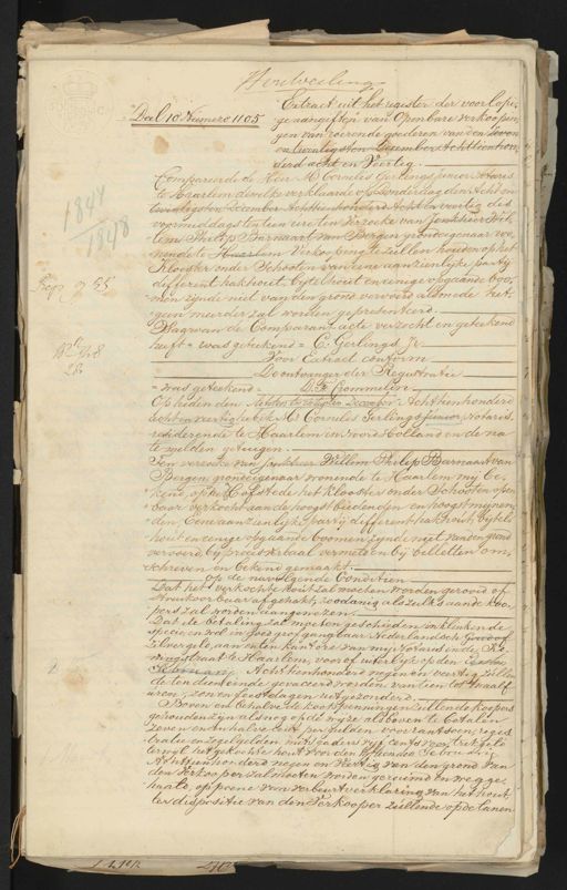 1 Rej g BC 18 3/28. 8 1.101½ Houtveiling Extract uit het register der voorlopi„ Deel 10 Numero 1105 ge aangiften van Openbare verkoopen„ gen van roerende goederen van den Zeven en twintigsten December Achttienhon„ derd acht en Veertig Heer M=r Cornelis Gerlings Junior Notaris Compareerde de te Haarlem dewelke verklaarde op Donderdag den Acht en twintigsten December Achttienhonderd Acht en veertig des voormiddags ten tien ure ten Verzoeke van Jonkheer Wil„ „lem Philip Barnaart van Bergen grondeigenaar wo„ „nende te Haarlem Verkooping te zullen houden op het Klooster onder Schooten van eene aanzienlijke partij different hakhout, bijtelhout en eenige opgaande boo„ „men zijnde niet van den grond vervoerd alsmede het„ „geen meerder zal worden gepresenteerd. Waarvan de Comparant acte verzocht en geteekend heeft = was geteekend = C: Gerlings, J=r Voor Extract conform De ontvanger der Registratie D.F. Crommelin was geteekend= Op heden den Achten twintigsten December Achttienhonderd acht en veertig heb ik M=r Cornelis Gerlings Junior, Notaris, residerende te Haarlem in Noord Holland en de na te melden getuigen. Ten verzoeke van Jonkheer Willem Philip Barnaart van Bergen, grondeigenaar wonende te Haarlem my be„ „kend, op deHofstede het Klooster onder Schooten open„ „baar verkocht aan de hoogstbiedenden en hoogst mijnen„ „den, Eene aanzienlijke partij different hakhout, bijtel„ hout en eenige opgaande boomen zijnde niet van den grond vervoerd, bij procesverbaal vermeld en bij billetten om„ schreven en bekend gemaakt. op de navolgende Conditien Dat het verkochte hout zal moeten worden gerooid of struikoorbaar afgehakt, zoodanig als zulks aande koo„ pers zal worden aangewezen. — Dat de betaling zal moeten geschieden in klinkende specie, en wel in goed grof gangbaar Nederlandsch Goud of zilvergeld, aan en ten kantore van my Notaris in de Ko„ ningstraat te Haarlem, vóór of uiterlijk op den Eersten Februarij Achttienhonderd negen en veertig zullen de ten dien einde gevaceerd worden, van tien tot twaalf uren, zonen feestdagen uitgezonderd. Boven en behalve de kooppenningen zullen de koopers gehouden zijn als nog op de wyze als boven te betalen zeven en een halve Eent per gulden voor rantsoen, regis„ „tratie en zegelgelden, mitsgaders vijf cents voor trekgeld terwijl het gekochte hout voor den Vyttienden Februari Achttienhonderd negen en Veertig van den grond van den Verkooper zal moeten worden geruimd en wegge„ haald, op poene van verbeurt verklaring van het hout, ten dispositie van den Verkooper zullende op de lanen DHC