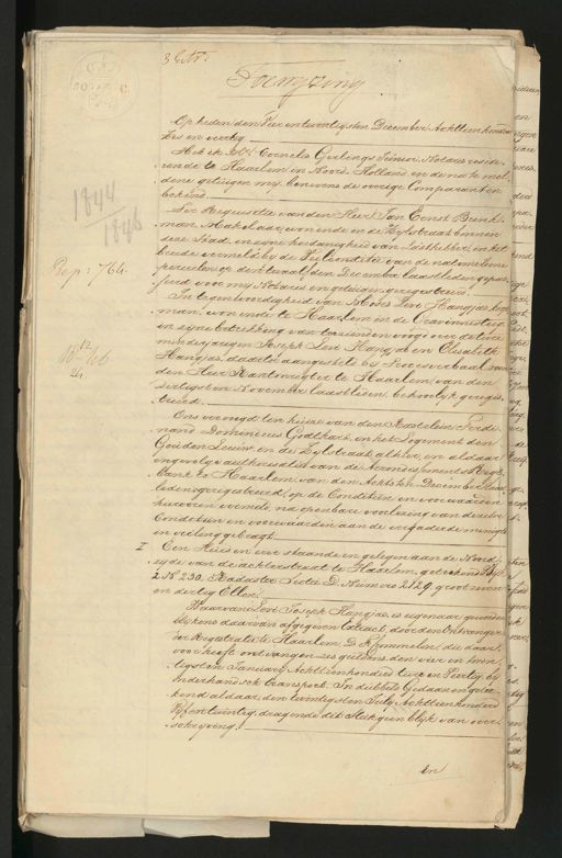 50d Prep: 764. 18= 46 24 2 3 Gitr Bewyzing Op heden den Vier en twintigsten December Achttien honderd Zes en veertig Heb ik M„r Cornelis Gerlings Iunior, Notaris reside„ „rende te Haarlem in Noord-Holland, en de na te mel dene getuigen mij, benevens de overige Comparanten bekend. Ter Requisitie van den Heer Jan Ernst Brink. man Makelaar, wonende in de Zijlstraat binnen deze stad, in zijne hoedanigheid van Lasthebber, in het breede vermeld bij de Veilconditie van de natemeldene perceelen op den twaalfden December laastleden gepas„ „seerd voor mij Notaris en getuigen geregistreerd. In tegenwoordigheid van Moses Levi Hangjas koop man, wonende te Haarlem in de Gravinnesteeg, in zijne betrekking van toezienden voogd over de twee minderjarigen Ioseph Levi Hangjao en Elisabeth Hangjas, daartoe aangesteld bij Procesverbaal van den Heer Kantonregter te Haarlem, van den Dertigsten November laastleden, behoorlijk geregis„ treerd. Ons vervoegd ten huize van den Kastelein Ferdi„ nand Dominicus Godthart, in het Logement den Gouden Leeuw, in de Zijlstraat alhier, en aldaar ingevolge authorisatie van de Arrondissements Regt„ bank te Haarlem van den Achtsten December laast„ leden; geregistreerd, op de Conditiën en voorwaarden hiervoren vermeld, na openbare voorlezing van dezelve Conditiën en voorwaarden aan de vergaderde menigte in veiling gebragt. Een Huis en erve staande en gelegen aan de Noord„ „zijde van de achterstraat te Haarlem, geteekend Wijk 2 N 230. Radaster Sectie D. Numero 2729. groot zeven en dertig Ellen. Waar van Levi Ioseph Hangjas, is eigenaar geworden blijkens daarvan afgegeven Extract, door den Ontvanger der Registratie te Haarlem, D. F: Crommelin, die daar„ voor heeft ontvangen zes guldens, den vier en twin tigsten Januarij Achttien honderd twee en Veertig. bij onderhandsch transport. In dubbeld Gedaan en getee„ kend aldaar, den twintigsten Iulij Achttien honderd Vijf en twintig, dragende dit stuk geen blijk van over„ „schrijving. En pideren„ en regen ware enes„ derd epa„ veder ind ige cai ook„ edi„ itoe ige„ ore Ven ig burg. er. der Creij. ge. Nop D„ ten froid „gen ik veer „„ 10. „tig en lins oost 3