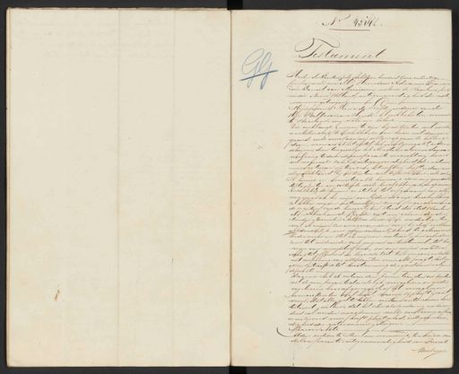 — N=o 4514½ Testament. Hoden den Eersten Julij Achttien honderd twee en zestig. Compareerde voor M=r Henricus Adrianus Francis„ „cus Daniël van Meeuwen, notaris te Haarlem, prt. „vincie Noord Holland, integenwoordigheid der nate „noemene getuigen. Mejufvrouw Maria de Liefde, weduwe van den Heer Baltarar van Hende, kleerblekster, wonend te Haarlem, mij notaris bekend Die verklaarde genegen te zijn bij uitersten wil ooerhe„ „re nalatenschap te beschikken, en van haren wil dienaan„ „gaande reeds vooraf aan my notaris opgave te hebben ge„ „daan, waarvan ik het onstel heb gereedgemaakt, en doen schrijven, dien ten gevolge heb ik notaris alvorens daarvan voorlezing te doen, de comparante verzocht mij haren wil nogmaals zakelijk, integenwoordigheid der natenoe„ „mere getuigen op tegeven, het welk zij heeft gedaan er alzoooerklaard bij uitersten wil te beschikken, als volgt Ik herroep en vernietig alle bevorens door mij gemaakt testamenten en uiterste wils beschikkingen, en op nieuw beschikkende benoem en stel ik tot erfgenaam van alles waarover ik bij mijn overlijden de vrije beschikking zal hebben myner natuurlyken zoon Ingeschrevenin de registers van de burgerlijken stand der stad Haarlem als: — Abraham de liefde uit mij geboren den der„ „tienden November Achttien honderd zes en dertig, ter„ „wijl ik mijnen zoo evengenoemden zoon, bij deze verklaar uitdrukkelik voor myn notuurlijkkind te erkennen Verder noem en stel ik mijner natuurlyken erkenden zoon tot uitvoerder van mijnen uitersten wil, tot be„ zorger van mijn sterfhuis, en om mijne nalaten. „schap tot effenheid en liquiditeit te brengen, en zulks met verkeening van alle daartoe vereischte magt, lasten gezag, spetiaadie tot bezitneming der goederen volgens de wet. Daarna heb ik notaris den bovenstaanden uitersten wil de comparante duidelijk voorgelezen, en nadie voorlezing haar afgevraagd, of het voorgelezene harenuisters ten wil beat, waarop zijf heeft geant „woord, dat alles wel te hebben verstaan en te wezen haar testament willende, dat het zelve als zoodanig na haren dood zal worden nagekomen welke voorlezing afcra en antwoord medesheeft plaatgehad, integenwoor„ dig heid der natenoemene getuigen. Waarvan Acte Aldus verleden te Haarlem voornoemd, ten huize van de Comparante, integenwoordigheid van Fredrik Houtman
