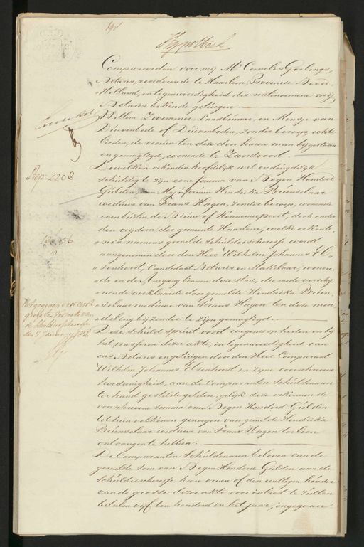 n Rep: 2208 uitgegeven voor een te gsmeten Verzoeke van de schuldeisscheresse den 3 January 7856 191 Hnpotheek Compareerden voor mij M=r Cornelis Gerlings, „ Notaris, residerende te Haarlem, Provincie Noord, „Holland, in tegenwoordigheid der natenoemene mij Notaris bekende getuigen. Willem Zwemmer, Landbouwer, en Mensje van Duivenbode of Duivenboden, zonder beroep, echte lieden, de vrouw ten deze door haren man bij gestaan en gemagtigd, wonende te Zandvoort. Dewelken erkenden hoofdelijk wel en deugdelijk schuldig te zijn eene somma van Negen Honderd Gulden, aan Mejufvrouw Hendrika Brunselaar weduwe van Frans Hagen, zonder beroep, wonende even buiten de Nieuw of Kennimerpoort, dich onder den vrijdom der gemeente Haarlem, welke erkente, „nis namens gemelde schuldeischeresse wordt aangenomen door den Heer Wilhelm Johannes El„ „Tenhorst, Candidaat Notaris en Makelaar, wonen„ „de in de Anegang binnen deze stad, die mede verschij„ „nende verklaarde door gemelde Hendrika Brun„ „selaar weduwe van Frans Hagen ten deze mon„ „deling bijzonder te zijn gemagtigd. Deze schuld spruit voort wegens op heden en bij het passeren dezer akte, in tegenwoordigheid van ons Notaris en getuigen door den Heer Comparant Wilhelm Johannes Elsenhorst in zijne voorschrevene hoedanigheid, aan de Comparanten schuldenaren ter hand gestelde gelden, gelijk deze erkennen de voorschrevene somma van Negen Honderd Gulden tot hun volkomen genoegen van gemelde Hendrika Brunselaar weduwe van Frans Hagen ter leen ontvangen te hebben. De Comparanten schuldenaren beloven van de gemelde som van Negen Honderd Gulden aan de schuldeischeresse hare erven of den wettigen houder van de grosse dezer akte voor intrest te zullen betalen vijf ten honderd in het jaar, ingegaan „