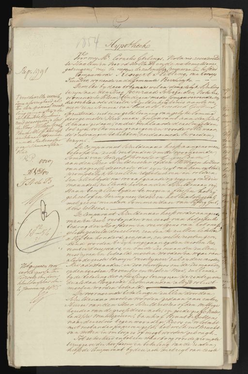 R. vooo AVDj=r J A de B Hitgegeven voor eerste grosse ten Verzoeke van den schuldeisscher der 4 January 1855 W 5 Hypotheek Voor my M:r Cornelis Gerlings, Notaris, residerende te Haalem in noord Holland en de natemeldene getuigen, mij te nevens de natemelden Comparanten bekend Compareerde Rengert Sletting, van beroep Trunder, wonende in de Gemeente Beverwyk- Dewelke by deze erkende wel en deugdelyk schuldig te zyn aan den Heer Coenraad Schreuder, Notaris, wonende te Vlsen, bindezen mede Compareerende en die verklaarde dezelve schulderkentenis aante ne„ men eene somma van twaalf honderd Guldens. spruitende uit eene geldleening van gelyke somma door gemelde Heer mede Comparant aan den schul„ denaar gedaan, en die verklaarde dezelve gelden tot zyn volkomen genoegen en voor de volle waar„ de ontvangen te hebben, en daarmede te vreden tezyn. De comparant schuldenaar heeft aangenomen, beloofd en zich verbonden om de voornoemde somma van twaalfhonderd guldevs. aan den Heer schuldeischer of den Wettigen houder van de grosse dezer acte die zyn regt van hem ontland, promptelyk te zullen restitueeren en voldoen, ten allen tyde na voorafgaande opzegging van drie maanden, zullende het aan den schuldenaar vrij, staan ten allen tyden te mogen aflossen hetzy geheel of in terminen edoch in het laatstegeval met geene mindere sommen dan van Vyftig Gul„ dens telkens. De Comparant schuldenaar heeft verder aangeno„ men en zich verbonden om eerst van het geheele bedrag der Hoofdsom en vervolgens van het onaf„ gelosde gedeelte derzelver, renten te zullen betalen a Vyf ten honderd perjaar, en welke renten geve kend worden te zin ingegaan op den eersten no„ vember dezes jaars, en omde zes maanden zullen verschynen en betaald moeten worden en waar van alzoo de eerste termyn verschynen zal op den arster Mei aanstaanden, en zoo vervolgens om de zes maande op den eersten November en eersten Mei, zullende by de betaling der aflossings termynen de renten over de als dan loopende zes maanden altyd voluit moeten worden betaald. De voornoemde betalingen zullen door den schuldenaar moeten worden gedaan aan en ten Huize van den Heer schuldeischer of den wettige houder van de grosse dezer acte, in goede grofte Neder„ landpre muntspecien, bank of muntbeljetten, naar derzelver tegenwoordige Koers en volstrekt niet met ander papieren geld, het welk uit kracht van wetten in omloop is of mogt worden gebragt. Tot zekerheid en tot eén waarborg voor de prompte teruggave der hoofdsom en betaling van de renten heeft de Comparant by deze acte met regt van eerste