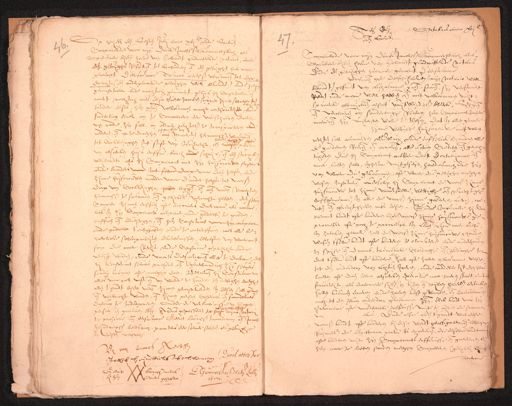 den den Sesten Julij anno xvjc. ende Seven Compareerde voor my Dirck Jacobsz Gommeslach als Openbaer bij den hoeve van Hollandt geadmitteerde notaris, ende en getuijgen residerende tot Schuldig ende een getuijgen hier naer genoempt, d'eersame Tomas vertsz wonende tot der drecht den ondergenoemde getuyghen wel bekent) ende heeft geconsitueert ende machtich gemaect, gelijck hij Constitueert ende met machtich mits desen Pieter Jacobsz sper zijnen swarte sonder deses, hem geven volkomen macht authoriteijt ende sonderlinge level, om te Compareren ter vierschueren daer van noode zijn sall, om daer rechtel. te transporteren ende rederen ende op te draeghen, Maerten henen tot Cockkeinghen int Stift van Buijtrecht, en ses van alsulcken huijs erff, burch inde schuijr ende een stucxken veijlandts, als hij Comparant met zijn huijsvrouwen suster ende boeders voor int selve dorp voor den helft, ende zijne huijsvrouwen moeder voor d'ander helft int voorss. dorp van Cockinghen hebben leggende, ende aende voorn. maerten hermansz te saemen ende gelijckel. verricht hebben, den selve Cooper zinnen erffven ofte actioners daerinne als naeme lijck in zijn Comparants aenpart ende gedeelte, te goeden erffven ende bevestighen, ende hem Constituant voor zyn aenpart ende gedeelte ontgoeden ende te onterffven, met alle be¬ heerlicke solempniteiten, bekentenissen, behoeften van warant sop die naer recht ende Coustume gepleecht ende vereijst worden, ende voorts diesaengaende alles te doene, en sij Constituant selvers present ende tegenwoordich zijnde selver soude konnen ofte mogen doen, Behoevende hij Constituant alles voor goet, vast ende van waerde te houden en enighe daeghen allen t'gundt bijde voorn. zijnen geconsitueerden in desen sal ge¬ ende verbracht worden, ende zynen persen Costeles ende smedelies daermen te Indemneren. Onder de verbintenisse persien ende goederen etc. Aldus gepasseert ter huijse mijns Notarij ter presentie vande eersame Gerrit Lourisz timmerman ende Jacob Heijndricxsz belleman poorters derselver stede, als getuijge desen versocht By my Jan Aertsz Jacob Heijndricksz bollen Quod attestor Ger van merck van Nots. Publ. vier g. 2 1667 Octobris anne wil de Een Een Seven 47 Compareerde voor myn dirck Jelissz Gommerslach als Openbaer bij den hoeve van Hollandt geadmitteerde notaris Ende den getuijgen hier naer genoemt d' eersame wonende opte Delfs haeren mijn Notario wel bekindt gesondt van lichame gaende, staende sijn verstandt reden inde move wel hebben een met volkomen vuijt spraeck gebruyckende alsoot uijtvleydel. bleeck, Seggende ende verclaeren om sonderlinge redenen hem Comparant daertoe moeverende zyn vuijterste wille te wesen dat in allen gemeene syne wettigh huijsvrouwe met vollen rechten sall aenneerden eeuwich ende erffelick behouden alle de goederen Roerende ende erven, alle actien, Crediten ende gerecht ticheden die hij Comparent metter doot ontruymen ende naer sieten sal, eghele vuijtgeseijt, hoedanigh zijn van waer die geneemen, ofte waeren geleghen moghen vesen Instituerende ende sulcx hij Comparant de voorss. zijne huijsvrouw tot zijne universaellen, wettighe ende gerechtigh erffgenaeme, in alle de voorss. zijne goederen, actien, we¬ diten ende gerechtigheden mits desen. Ende valle hij den parent kindt ofte kinderen bijde voorss. zijne huijsvrouwe ge¬ prove oft noch te procreeren In leven syn naer Liete in zulcke gevalle zal de voorss. zijne huijsvrouwe gehoude vlesen tselve kindt ofte kinderen te alimenteren ende ende houde in spijs ende dranck, taemelijcke cleedinghe ende leedinge tot dat t'selve kindt ofte kinderen zal ofte zullen gekomen wesen tot den ouderdom van achtien Jaeren, ende middeler tijt deselve laeten ofte doen heeren alsulcken exercitie naer haeren staet ende fonteijt, als daermede sijl. in tijden ende wijlen haerl. eenicken sullen koenen enderen ende haeren kost gewinnen, ende daerbove noch tot den selven onderdam gekomen zyn, elck kindt voor zijn patronen ofte voederlycke erffenisse vuijte te sullen de somme es, Ende alsoo allen t'gundt wit desen voorss. kindt ofte kinderen bij desen werdt geassigneert ende bewesten Ruijmel. de legittime portie is excederen, die deselve kindt ofte kinderen vuijt zijn Comparants erffenisse ende goederen bij hem naerte lieten souden moghen Competeren gelijck hij roo vere