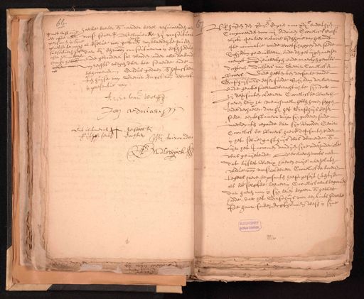 66 Op huijden den xiijen. April anno xvjc. ende thijen met last omme zaecke breder ende naerder bevel requireerden als Compareerde voor mij Adriaen Cornelisz Mols een ofte meer voorss. staet, Beloovende zij constituant wijck, openbaer Notaris bij den hove van hollandt plaetse te mogen al tselve voor goet te van waerden te houden, persoonen in sijne opte nominatie vande Vroetschappen der stede substitueren gel. dat bij den voorn. constituant in desen heden Schiedam geadmitteert, ende den getuijgen naerte¬ macht hebben ende gesondert sal worden, onder alle verbanden ofte gelimitteerde noempt Dieuwertgen, ende Maertgen Gerrits inden omt Caprechts wegen daer toe staende ende dochteren, dochters van Gerrit Cornelissen behoorende. Aldus gedaen ende gepasseert Broers, Ende hebben ten versoecke vande ten huijse van Gerrit Dirxsz van Wolff Gasthuijsrs. deser stede Schiedam verclaert in presentie van ende geattesteert warachtich te sijn, dat zij deposanten Leevert Cornelisz de Broers Arent van Wolff haeren hun za: menichmael hebben hooren seggen, ende verhaelen, dat hy het Gasthuijs deser Jan Gedaen stede, een testament vuijt sijn goederen soude maecken, ten regarde dat sijn Broeder Gerrit Dit ist merck gestelt bij Cornelisz de Broers, haere deposanten vader fijtgen, senten dochter Meij toirconde in het selve gasthuijs was woonende, ende vuijt het Incoomen vandien sijne onderhoudenisse Bleijck was genietende, Verclaeren voorts mede dat Lijsbet Vrerix haeren moije, naergelaten wedue van voorsz. Leevert Cornelis de broers, tegens haere deposanten heeft geseijt ten tijde als de selffde leevert Cornelisz was begraven dat haeren man in sijn leven begeert ende gewilt hadde, dat het Gasthuys voor een kints gedeelte ofte hant, soude Erffgenaem wesen in syne sterdam Cate