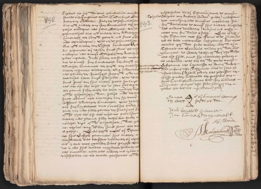Capitael tot laste vant gemeenelandt van H staende ten Comptoire vande Hr. Ontfanger ge¬ Johan van Berckel Item aen de gesamentlijcke 1642 kint off kinderen van Jan Lambrechts ten hove gelijck vierdepart inde selve Obligatie, aen de gesamentlijcke kint off kinderen van Maertgen Lambrechts ten hooft getrout met Jacob Be¬ mede een vierdepart, ende aen de gesamentlijcke kint off kinderen van Lijsbeth Lambrechts ten za: geprocreert bij Willem Jansz Poort het res¬ vierdepart inde voorsz. Obligatie van Achtien st. gulde capitael, met sulcken verstande nochte dat de voorss. Jan Lambrechts ten hooft ende Maertgen Lambrechts ten hooft van haerluijd kinderen respective vierdeparten, elcx sullen trec¬ ende genieten den Jaerlicx Interest ofte re¬ haerluijder leven langh geduijrende, ende wil¬ Jansz poort van sijne kinderen portie soo lange ende ter tijt ende wijle toe de selve ende elcx hen gecomen sullen wesen tot haren mondigen dat ofte huijwelijcken state, gelijck mede den v Jacob Bernou naer t'overlijden van sijn voorn. Huisvrou Maertgen Lambrechts, ende de huijs van Jan Lambrechtsz naer t'overlijden vanden haren man mede sullen genieten den Jaerlicx In ofte rente ter tijt ende wijle toe haerluijder kinderen mede gecomen sullen wesen tot haren mondigen dage ofte huijwelijcken state, ge¬ int reguart van Willem Jansz Poort hier van is geseijt. Ende heeft voorts hij Testateur tot sijne Erffgen. genomineert sijne kinderen, kintskinderen ende derselver decendenten bij repre¬ tie in haer voor overleden Ouders plaetse ende dat in alle sijne vordere naertelaten goederen roo ende onroerende, actien ende crediten niet in ende vuijtschulden niet ter werelt gereserveert of vuijtbesondert die hij Testateur (boven de voorsz. Thuijn ende Obligatie van Achthien hondert gulde :) metter doot ontruijmen ende eenichsints achterlaten sal 82 Institueerende de voorss. sijne kinderen, kintskinderen ende vordere decendenten, daerinne met vollen rechte van Institutie bijdesen, Ende op dat desen Testamente naer sijn forme ende innehoude des te beter achtervolcht naergecomen ende ter executie gestelt soude werden, heeft hij Testateur tot Executeurs vandien gestelt ende genomineert de Heeren Weesmeesteren deser Stede inder tijt sijnde, omme sijn naertelaten goederen te aenvaerden, ende ten beste vande voorss. alle het welcke etc. Erffgenamen ende legatarissen te administreeren ende conform desen Testamente onder de selve te swart etc. versouckende etc. distribueeren, Aldus gedaen ende gepasseert ten huijse vanden Testateur ter presentie van Joris Cornelis Duwater ende Jan Leendersz Duijnevelt burgers deser stede getuijgen van gelove hier toe met mijn Notaris gereqt. Dit merk is bij Lambrecht Harmen ten hooft, selffs gestelt Joris Cornelisse Couwater Jan Lendersz duijnevelt Mij Toirconde D: Hue