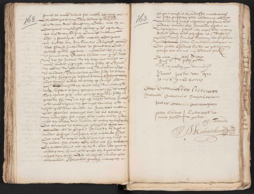 somme de voorn. wedue sal moeten aennen Een Obligatie van Thien hondert gulden 162 Laste van Aert Jansz van Driel, noch een Obligatie van Vijff hondert gul. capitael tot laste van Sijmon Dammisz Molenaer beijde in Poortugael ende noch een Obligatie tot laste van Jan Cornelis Burgersz woonende onder Perns, innehoudende de somme van drie hondert gulden capitael, maeckende te samen de somme van Achtien hondert car: gul., daer van dat de Interesten ten behouve vande voorn. wedue, ingangh nemen sullen op Hans den Eersten October naest comende, ende de vordere Thienhondert gulden sullen de kinderen gehouden sijn, gelijck deselve beloven bij desen, te betalen aende voorn. wedue te betalen op Meije Anno xvjc. envijftich, mede naest comende, ofte indien deselve kinderen genegen mochten sijn de voorss. Thien hondert gul. onder haer te behouden, sullen gehouden sijn van die tijt aff aen, te betalen Intrest ofte rente tegens den penningh twintich ofte vijff gul. vant hondert int Jaer, totte volle ende effectuele betalinge toe, die tot believen van wedersijden sal mogen ende moeten werden gedaen mits den anderen drie maenden te vooren waerschop ende benevens de betalinge opleggende ende betalende alle de verlopene Interesten ten dage vande lossinge verschenen ende onbetaelt sijnde Dat noch de voorn. wedue daerenboven vuijt den boedel sal trecken Een bedde met sijn toebehoor¬ Een webbe linne met een kist, ende alle hare cleederen van Linne ende wolle ten lijve ende rugge van haer wedue eenichsints dienende ende behoorende, Belovende parthijen contrahenten het gene voorsz. is ten wedersijden onverbreeckel. te sullen presteeren ende naertekomen, Ende 168. verbande van haerl. respective persoonen ende goederen, roerende ende onroerende, egeene vuijtbesondert, subject allen rechten ende rechteren Aldus gedaen ende gepasseert int sterffhuijs vande voorn. Cornelis Soeteman ter presentie vande voorn. Pieter Cornelisz Rouwenhove ende Pieter Leendersz Coster als getuijgen van gelove hier toe met mijn Notaris gere¬ is bij Aeltge Dit merck Jans dr. selffs gestelt Sijmen Dammisz Pieter Jooste van Ton Joost Jansz kerij Claes Cornelessen Coeteman Cornelis Cornelis Jonge soeteman pieter Cornelis bouwenhoven Pieter Leendersz Coster heeft dit merck selffs gestelt Mij Toirconde Jouwenhove
