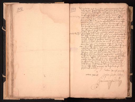 Op huijden den xiijen. December xvic vierenveertich Compe. 982 983 voor mij Jan Willoets Openbaer nots. byden hove van Hollant geadmitteert, binnen Schiedam residerende ter pntie vande getuijgen naergenomineert Pieter Gillisz Stoeldraeijer woonde binnen deser Stede schiedam mij notario, ende de getuij bekende bij wel bekent) de welcke ^ voor hem sijne erven ende nae comelinge, wel, ende deuchdelijcken schuldich te wesen D'eerbaere Anna Dircx van wijck, woonende binnen desen Stede schiedam, ofte den wettigen Thoonder deses de somme van hondert car: guldens te xl grooten vlaems tstuck ter saecke van deuchdelijcke gelevende, ende aengetelde penningen tot genoegen ende goet contentement van hem Comparant soo hij ons verclaerde aengetelt, versoeckende mitsdien, de exceptie van ongetelden Gelde, welcke voorss. voorn. Comp. somme noch vermogen sall, ende oock gehouden bes¬ te lossen tot vermaninge, mits malcanderen ende vierendeel Jaers te vooren, waerschouwen ende dat metten Intresse vandien, tegens den penningh twintich, ofte vyff ten hondert int Jaer, daer van het eerste Jaer Intrest ommegecomen, ende verschenen wesen sal den xiijen. December xvic vijffenveertich geduijerende soo voor van Jaere et Jaere totte volle ende effectuele afflossinge vande voorss. somme van hondert can gul. toe, daer onder verbindende hy Comparant sij persoon, ende alle sijne goederen, roerende, onroerende present, ende toecomende egeen vandien wtbesondert tellende de selve ten bedwanck van allen scheeren ende rechteren, Alle dinck sonder arck, ofte list, Aldus gedaen, ende gepasseert binnen der Stede schiedam ten presentie van Willem Jansz Poort Cleermaecker ende Jochem Jansz Gedaen, Clercq. beijde woonende binnen deser Stede getuijgen, ten desen versocht, ende sonderlinge geboden Willem Janse poort pieter Jellis Jochem Jansz Judaen Pieter Nots Publ