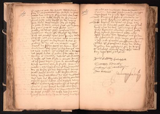 ende ongemunt niet ter werelt wtbesondert sulcx de eerstooverledene van hen beyden de selve 16 metter doot ontruymen, ende naerlaeten sall, als ende dat met vollen rechten van Institutie Voorts willen, ende begeven sij Testateuren met dat de langstlevende van hen beyden sal hebben te leveren, eenige staet ofte Inventari¬ van haerl. naer te laeten boedel, ende goederen, aen eenige heeren weesmeesteren weesmannen, Schout ofte Gerechte tsy waer ende tot wat plaetse tselve soude moegen werden versocht, ofte gerequireert veel min open¬ ofte de scriptie van desselffs boedel, ende goederen te doen als niet willende, nochte begerende dat sijl. hen nopende het bewint, ende administratie over haerl. minderjarige naer te laten erffgen., ofte erffgen. als mede wel des selffs boedel, ende goederen sullen hebben, te bemoeije, ende onderwinden, directel. off indirectel. in rechten, off daer buyten, in eeniger maniere als deselve behouden haer d' eerwaerdighen by desen excluderen, ende buyten sluyten, maer willende, ende begeren dat de langstlevende van hen beyden sal doen behoorlijcke wtcoop mette naeste vrunden, oude bloet verwanten vanden eerst overledene die bij de langstleven bess. daer toe bequaem sal werden geoordee nopende haerl. kinderen, ende erffgen. vaderl. ofte moederlycke erffenisse ende besterffen ende dat de selve naeste vrunden, ende bloot verwanten beneffens de langstlevende van hen beijden, sullen ende wesen voochden over haerl. minderjaerige naer te laeten, erffge¬ als mede over desselffs naer te laeten boedel ende goederen, dit alles sonder contradictie, ofte 1661 tegenseggen van ijmanden, Alle twelcke de voorn. Comparanten seyden, ende verclaerden te wesen haerl. Testament wtterste ende laeste wille begerende dat tselve als sulcx te minsten als Codicille gifte, ter cause des doots, onder den leven off andersins soo een ider Testament alderbest plaets houden magh volcomen voortganck hebben, ende effect sorteren sall, Alwaert oock soo dat alle solemniteyten naer rechten gerequireert in desen niet en waere geobserveert, Aldus gedaen ende gepasseert binnen der Stede Schiedam ter presentie soon Jan Anthonis ende Huybert Gerritsz Cols beyde woonende binnen deser stede getuijgen ende Jan Londen hoolven hoek Geertgen Dircks huybert Gerrits sool Jan Anthonisse Block Nots publ.