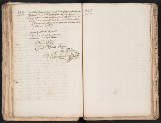 845 te houden, Onder gelijck recht ende verbant alsboven Aldus gedaen ende gepasseert ten Comptoire mijns Notaris ter presentie van Govert van Gesel mede Notaris ende Cornelis Vander Heijn mijn Clercq als getuijgen van gelove hier toe met myn Notaris gereqt. Pieter Pietersz Buurvelt dit merck bij Jan Pietersz melcke gestelt J: van Gesel Cornelis Vander Heijn Mij Toirconde 4 A: Houwenho etc. 1665