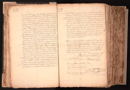 119 1118 Ende voldoeninghe vant geene voorsz. is, haerluijder transporte te doen, met ende op Conditien, dat d'van persoonen ende goederen roerende ende onroerende present Cornelis Claesz Derckel, ende Joffr. Margareta ende toecoomende egeen vandien wtgesondert, stellende sijne huijsvrouwe, ende naer haer beijden overlijden den deselve ten subjectie van allen heeren rechten ende haere kinderen, haer comparantes leven lanck geduij¬ rechteren, Versouckende aen handen mijns Notaris haer comparante in cost ende clederen, sullen moeten op hijer van gemaect, ende gelevert te werden acte houden gelijck d' voorn. Derckel ende sijne huijsvrou een ofte meer in debita forma, Aldus gedaen ver¬ nu ontrent anderhalff Jaeren aenden anderen ge¬ leeden ende gepasseert, ten huijse vande voorn. Corns. hebben, Doch soo sij comparante begeerde op een Claesz Derckel, staende op de hoochstraet te woonen, dat d'voorss. Cornelis claesz ende sij binnen deser steede, In presentie van Pieter gerritsz huijsvrouwe, Mitsgaders haere voorss. kinderen ende Crom, Adriaen Gijsbrechts, Arien Thomst kannetges Insgelix in cost ende clederen sullen onderhouden Mits dat het selve nyet en sal excederen ofte meer ende Joost Gerritsz gelooffwaerdige getuijgen tot bedraegen als de somme van hondert ende vyftich gul. desen versocht ende gebeeden Jaerlix, ende dat d'selve bovendien meede gehouden Ende alsoo de voorn. Anneken Arents dr. vermits sijn, als zij comparante soude moogen geraecken dees aere voorss. blintheijt verclaerde desen niet te comen werelt te overlyden, haer eerlijcken te doen begraeven teijkenen, Soo heeft de selffde mitsdien mij haer comparantes qualiteijt. Ende hebben d'voor Notario versocht desen in haeren name te willen Claes Darckel, ende Joffrouwe Margareta Coij teijkenen, t'welcke ick ten behulpe voorss. ende ten res¬ huijsvrouwe mede voor mij Notario ende getuijgen pecte van mijns dienstlevenden ampts met d'selve rerende, ende hun sterckmaeckende, ende responderen niet en hebben connen weijgeren voor de voorn. haere kinderen belooft ende belooven bij Een oirconde voor haer ende voor dezelve haeren erven ende nacomen A: Molswijck Nots. dvoorss. onderhoudinghe ende alimentatie te zullen Jan Kinder legitta Coij haer voorsz. Anneken Arents leven lanck geduijren ende oock na haer overlyden, haer eerlycken te doen bij mij Pieter Gerritssen krom Verbindende de voorss. Cornelisz Claesz Derckel Joff vrouwe Margareta Coij voornt. voorde naco¬ Jan Adrijaen Gisbersen gestelt een is tmerck Gerritsz Bij mij Arien Thoonis Joost voornt.