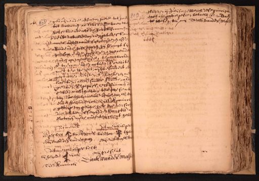1663 den iii Julij soo hebbe ick dese principaerff obligatie gesien betaelt ende voldoen 206 geduijrende alsoo van jaere tot ine te wesen bij mij Dirck vander Mist e 208 tot volcomen afflossicge toe, we verstaende als de hooftsomme dert dat als dai den inteest me mer advemandt sal minderen, Ve hindende hier vooren hij Compt. sij persoon ende goederen, roerende ende onroerende, tegenwoordi ende toecomende actien ende crediten niet ter werelt uytbesondert, ect allen Rechten ende Rechteren me kosten, alles sonder frande, alde gedaen ende gepasseert binnen den stede Schredam ter presentie van Bartholomeusz Arijenvan lstr ende heijnderijck Tijssz Hoornick getuijg van gelove hier toe versoch die dit beneffensz den Compt ende Notaris mede onderteickent hebb. dit merck is ges. ditmel is gestelt Jbi Rijner bij Bar thol Arrensz des Eudendnan Mijenissz Jan Ster dit merck is gestelt mispreses bij heijnde Grijck Dvock vander Mast Tijss Kooninck