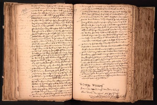 tractensz van uijtterste wille maeri nesurbl. comende ter dispositie van hae nae te laete goederen, lsoo ist dat sij Tist 98 verclaerde tot haere universeele erffgen. genmineert ende geinstitueert gs. sulcks sij die nomineert ende institueert bij te weeten, Weijntgen Jacobsz dr. huijss van Sijmon Willemsz wonende tot del voor de eene helft, ende Aeltgen Jaco dr. weduwe van Abraham Gerritsz so binnen deser stede, ende bij haer oversij haer dochter in haer plaetse inde weder helft van alle haere goederen roerende ende onroerende, tegenwoordige ende toe actusij ende crediten, niet ter wereltsondert, omme die ter stondt naer sy Testatrice s doot die aenvaerden in vrije eijgendom, met vollen recht van instimitsz dat Aeltgen Jacobsz dr. voo momt verobligeert blijft uijtte keeren uijt hae geerfde nederen dese naer volgende hij te weeten sij Testatrice leguteert aen Schreveltsz de somme van tien gulden een aen Gerrit Jansz met sijn susters t tien gulden, aen Anneken Jacobsz dr. getrout met Jan Cornelissz peeck stock gulden, aen Jacob het het hoff tien g Ende aen Maertgen Gerritsz dr. mede gulden, eijntelijck legateert sij Test ce noch aenden arme e bij de diaconije wert de somme van vijftich cars. guldens welcke beijde de geinstitueerde erffgensaemen sullen moeten uit keeren elck vyff twintich gulden, wijders heeft sij testat. gewilt ende geordonneert dat haere naerti goederen eerst sullen gedeelt werden teijnde weecken van haer overlijden, sonder op het boelhij te mogen vercoopen maer sullen die met m canderen rustelijck ende vredelijck moeten deelen t'welck sij Testatrice haere erffgen. wel expresselijck bij desen is belastende ende recommanderende, Alle twelcke voorss. is haer testatrice duijdelijck ende perfectelijcken voor gelesen sijnde, seijde ende verclaerden dit te aldus uijt haeren vrijen onbedwongen wille t voortgecomen te sijn, sonder inductie persuatie ofte msleijdige van ijmandt ter werelt ende ier te wesen haeren uijtterstenwille ende Jere laetste begeerte, die sij wilt ende begeert dat naer haer overlijden stricktelijck ende Ell. onverbreeckelijck achtervolcht ende muer gecomen sal werden t'sij als testamentr Codicille, donatie Cause mortisz, ofte anders sints, soo die best naer rechten coustumen credertueren gewoonte deser landen sal mogen bestaen, alhoewel eenige solemniteijten van Rechten hier inne noodich gerequireert verswuijmt mochten sijn, derogerende oock bij desen alle keuren, ordonnantien, pluccaten ende se Rechten ter contrarie, aldus gedaen ende gepasseert binnen Schuldam ten huijse vande Testatrice ter presentie van harmen Willemsz vandr. Burch ende Theunis Jansz van wyk getuijgen van goeden geloove hier toe gerequireert, die dit beneffensz de Testatrice ende mij Notario mede onderteijckent hebben Beertge Wijllem Harman Willemsz van der burch teenis Jansz van wijck mij present Dirck vander Masnot