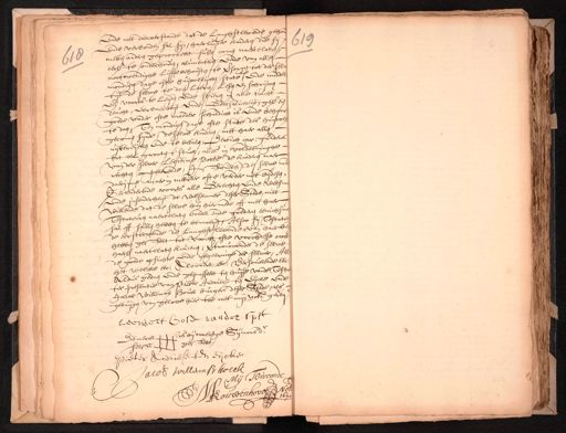 ende met dien verstande dat de langhstlevende geho¬ ende verbonden sal sijn, haerluijder kinderen die sij metten anderen geprocreert sullen comen naetelaten eerl. te onderhouden, alimenteren ende van alle 618 nootwendighe lijffs behouften te versorgen tot derselve mondigen dage offe huijwelijcken state, ende middel¬ tijt de selve te doen leeren, Lesen en schrijven ende voorts te Leijden ende stieren in alle tocht deucht, eerbaerheijt ende Godtsalicheijt, gel. een goede vader ofte moeder schuldich is ende behoor¬ te doen, ten mondigen dage ofte state des huijven gecomen sijnde deselve kinderen, met haer alle uijtreijcken ende te betalen, Dertich car: guldens tot xl grooten t'stuck, alles in voldoeninghe van der selver Legitime portie de kinderen naer rechten, competerende, Instituerende deselve met daerinne maer in meerder ofte verder met bij desen Secluderende voorts alle Gerechten ende weesm ende insonderheijt de weeskamer deser Stede, niet willende dat de selve hun hiermede off met haer Testateuren naertelaten boedel ende goederen eenichsins sal off sullen hebben te bemoeijen, Alsoo sij Testate de eerstervende de Langhstlevende van haer be¬ hebben gestelt tot voocht ofte voochdesse over haerl. naertelaten kinderen, vertrouwende deselve de goede opsichte ende regeeringe der selver, Al¬ het welcke etc. Alwaert etc. Versouckende et Aldus gedaen ende gepasseert ten huijse vande Test ter presentie van Pieter Andriesz ten Eijcke ende Jacob Willemsz Bouck burgers deser Stede, als getuijgen van gelove hier toe met mij Nots. gereg¬ Leendert Oose vander spit Dit merk is bij maertge Sijmons dr. selffs gestelt, Pieter Andriesz ten eijcke Jacob Willemsz hoeck Mij Toirconde A: Housen