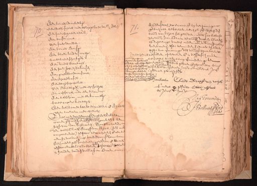 Een boradt manteltje een wolle schort met een lapge linde van 1½ Ellen Een paer schortecleedt, Een borstrock vier paer mouwen Een boradt Borsge Een blaeu kindts rock twee kinderschortjes, Een kindts wambaijs Een paer gebreijde kousen Een graeuwe mansrock, Een eijcke tafel Een wageschotte kist Vier Bordetjes, met een spiegel Een capstock, met een bennetge Een beddepan met een trommeltje twee copere keteltjes Een bedde met twee oircussens, ende Eijnde een lantaern met een stolen Ende naer dat de voorsz. Mobile Goederen van waren gebrocht, ende getransporteert ten huijse van Jan Sijbrantsz, Soo verclaerde den voorn. Claes Dircxsz van Wijck hier met comparerende) deselve te accepteren ende aent nemen in voldoeninge vande voorss. somme van Vierhondert gul. sonder eenige reserve, ende voorts deselve mebile Goederen te stellen ende gelaten in handen vande voorn. Jan Braem, omme bij denselven precario ende bij verwinninge 71 gebruijckt te werden, ter tijt ende wijlen de voorn. van wijck sal gelieven, des soo belooft den voorn. Jan Braem de voorsz. Mobile Goede ofte eenige vandien andermael te transporten verliqueren, ofte verminderen, maer ten allen tijde tot vermaninge vande voorn. eijck weder In vougen ofte sullen op leveren ende in desselfs handen te stellen, sonder eenige verminderinge ten hier vooren special. vindende alle de goeder werelt Aldus gedaen ende gepasseert binnen ter presentie die in plaetse van deser Stede, Jeroen Joost ende Gerrit Joos smobile goeden ringen werden Cassenaer getuijgen & cocht, voorts sijn persoon general. alle sijne van lederen egeen uijt de Jan braem Claes Dircxsz van wijck t merck gestelt tussen bij Jean Joost Mij Tonconde J: Bollaert 61