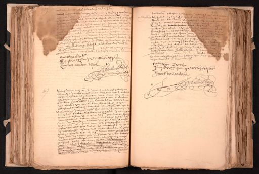 Ende voorts alles te doen ende verrichten alles in sulcken voegen ende manieren als den geconstitu¬ edtvinden sal, alwaert dat naden last vereyscht wiert als in desen geex¬ welcke nadere ende speciaelder last de in desen houdt voor geinsereert, Belovende te alle tselve van waerden tehouden ende der hier jegens te doen ofte telaten en onder verbant van haer persoon ende ge ist des geconstitueerden van zijne handeling ontfangh gesonden te doen behoorl. reecke. bewijs en Reliqua, Aldus gedaen ende verleden in schiedam ter van Hubrecht keijser ende Lourens vandr. beijde als getuijgen van wiel geloove hier toe versocht, ten dage, maenden ende Jan barbera klaesz huybrech gere keyser Laurens vander Wiel J: Bollaert 6 4 Compe. voor mij etc ende voorden ondergess. getuijgen Teuntje Jacobs ongetroude dochter oudt ontrent 26 jaren, Ende verclaerden met ware woorden, plaetse van Eede ten versoecke van d'Eerbare Barbera Claes wede. van Cornelis van Welesten za: overleden in Oostindien, warachtich ende haer attestante als noch seer wel kennelijck te zyn, dat Dieuwertje Jochums wede. die opden ix Januari ao. 1 binnen dese Stede Schiedam is overleden) onlangs haer overlijden of met de reqte. hare nichte spie¬ van seeckere twee obligatien, d'eene bij des re¬ ter somme van 728 gul. Capl. ende d'andere man za: ter somme van 252 gul. gepasseert ende on¬ zyde jegens de selve hare nichte, tot verscheyde malen op verscheijde tijden met ronde woorden duijdelijck geseijt heeft dat zij reqt. daer over gerust hout zijn, dat zij nochte haer kinderen, voor de betalen vande selve obligatie noijt aengesproken nocht geeijscht soude werden, en dat de van de voorss. obligatien voor soude maer van onder haer behieldt, om aen haer man dre dito wijlen lastich sonder wille varen geven de voorn. attestante voor allegen, schap dat zij ten tijde voorss. huyse vande voorn. Dieuwert ende bij die occasie haer helft duijdelijck heeft hoe nichte (die aldaer ten huyse horen seggen ende spreeckenen bij de attestante hier voren goede ende pertinente kennisse Wijders met verclarende vreesen¬ tyde tgene voorss. staedt int met solemneelen Eede te bevestigen gedaen ende verleden binnen der Stede pies ende van Cor hus keijser, ende Jacob beyde bij verte stede als getuijgen van gelove hier toe versocht dage maende ende Jare voorss. Teuntge Jacobs huybrech geersten Jacob vander Werve J:Bollaert Nots. 45 1672