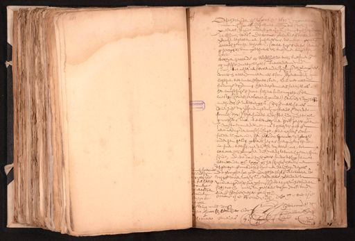 Op heden den 6e. April @o 1673 voor mij Jacob Bollaert, Openb. presentie vande ondersz. getuijgen, Martgen de Groeij wede. Dewelcke verclaerde ende bekent vercocht te hebben aen Jochems vos, die mede Comparen bekende gecocht te hebben, seecker huijs ende Erve, staende ende gelegen aende dam opden hoeck vande breestraet binnen deser geleden belegen hebbende aende Westsijde, de voorn. breestraet ende aende oostsijde Maertge Claes, streckende voor vande strate, tot achter aen seecker andere huijsinge vande vercoopster voorts in aller manieren als t'selve jegenwoordich beheijnt betimmert ende behaelt staet, Ende met alle soodanige vrijdommen, lijdende ende dominerende servituijten, als het voorss. huijs ende gront subject soude mogen sijn, ende den laeste waech reflecterende pondere) in dato den 2 maij 1667 innehouden ende medebrengende is. mij ende onbelast als A vier gul. van verpondinge daerop staende, voor de somme van Negenhondert en vijftien Car: gul. tot xl groot het stuck, te betaelen met 40 gereet opden 1 maij toecomende nevens 't geven vande gift ende aenvaerdinge der voorss. huijsinge, ende de resterende soo sal den Cooper onder het verbandt speciael. bijt vercocht onder hem houden, op rente, jegens vier gul. van thondert int Jaer te lossen, naer de tijt van twee Jaren, tot believen vande vercoopster, drie maenden te voorens gewaerschout sijnde, Ende dat vrijts gelts, soo dat de Coop sal moeten betaelen den xie. lxxxe. penn. het schrijven van brieven met den gevolge ende oock desen ende Copie met de Cleijn zegels noch speciaele de vercoopster sal op de opdrachte het huijs ende Erve beloven te te dat hij tallen tijde vrijen ende waren naerstige deser stede, verbindende tot sal hebben. voldoeninge deses haer persoonen ende goederen geen vuijtbesondert annexe subject etc. actum ter presentie van Jan Jansz vandr. ge aentestaen lier ende Wouter meijer getuijgen etc. voorde marye hendrick de groene by 250 £ tgelt oirconde phanus vo Jan Jansz vander leer Bollaert tot Water meus