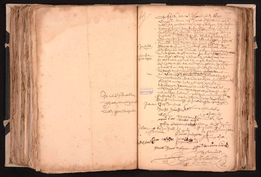 De reus van Rotterdam uijthoeck, wanneer gepa¬ de wede Schiel te daenvaerden Op heden den 20en. April @o 1673 48 Compe. voor mij Jacob Bollaert openb. nots. etc. ter presentie vande ondersz getuijgen, Christoffel ketingh forie, Jan Hansen, Capn. Mus Casianus meesterlings Corporael, Juriaen Juriaensz mede Corporael, Willem Sachijsz, Wouter Barentsz ton Pr. Joosten, Joos Adriaensz Vlug, Johannes oonenb. en van laers, Jan Jansz Brugman Jan Coster Bartel troost ende wr. Pietersz alle soldaten, onder het Regiment vande Colonel ende Baron de gemelt geweest Ende hebben ten versoecke van Jan Kastellieut guarnisoen van Capn. Blocq Eenparen geattesteert dat ponden alhier sij attestanten noijt off ten eeniger tijt, door den reqt. (gelijck hem ten laste wat geleijt, sijn versocht geweest om weg te gaen, ende onder het regiment van het voorss. Colenel te blijven ende deur maer ter Contrarie gerecommandeert haer attestanten ende de andere Soldaten, daeronder te blijven, haer commander verscheijde mael haer geduijrende wel ende trou¬ te gedragen, hetwelcke de andere Soldaten die mits leggende int Lieckhuijs als op de wacht, mede naer waerheijt soude cunnen getuijgen, Eijndigende etc. Presenterende etc. actum en schieden voorn. ter presentie van Sr. Marcussz ende hors Capper getuijgen etc. gemerct bij Jan Jansz den huyven Mensen gestelt by Willem Hachooren son wouter daeron. gesen adrijaen wtgestelt bij is bij Con Opt Joosten gestelt bij Jan Jans is bij bij notaris gestelt Brugman Bartel Joost gestelt Pietersz gestelt deel bode coper van Joris Jansz Copper Piemant mij toirconde Bollaert is 6 1