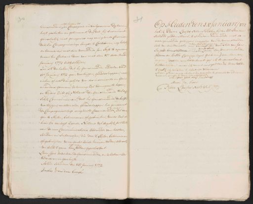 ^ tot heden tot Geinsinueerde ^ en Compagnie en voor gemeene Rekenin heeft gesleeten en getimmert; dog dat hij Insinuant ganschelijk niet genegen is nog eenigzints Convenie dezelve Compagnieschap langer te Contineeren, nog het si en timmeren met den voornoemde Jan Fafa te exercer maar ter Contrarie daar van met den 18e: dezer maa Januarij 1772 Uitescheijden Zoo is't derhalven, dat hij Geinsinueerde na dezen voors 18:e Januarij 1772 geen vaartuijgen, gereedschappen, mij rialen of iets diergelijks voor des insinuants en gein nueerdens gemeene rekening zal vermogen te kopen, en Wijders Zult gij Notaris den Geinsinueerde Wel ex selijk Communiceren, dat hij geinsinueerde de helft vaartuijgen, materialen, gereedschappen hoe genaam de Compagnieschap eenigzints concernerende ^ zal ver gen te slijten, betimmeren of gebruiken, Voorts zal d hier toe verzogt zijnde Notaris wel degelijk protes ren de non Communicatione, Als mede van kosten schaden en Interessen, die door 't slijten, betimmere of gebruijken veroorzaakt zoude kunnen worden, als ook van alle ’t gene kan ^ of nog worden geprotesteert Lever Copie dezes aan de Geinsinueerde, en relatier Uu Wedervaren in geschrifte Actum schiedam den 14e: Januarij 1772 Jacobus van den beergh 31 Op Heeden den 14:e Januarij 1772 heb ik Pierre Lassis Notaris Publicq bij den Ed: Hove van Holland geadmitteert, te schiedam residerende met de naargenoemde getuijgen ingevolge van de voorenstaande ^ dan den 1e ^t ^ ^ ter woonstede van Jan Acte van Auethonisatie mij vervolgt ^ en protes zijn formen inhoude Tafas de bovenstaande insinuatie ^ naar gedaan en hebbe Copie (op Zegel geschreven) aan hem over dewelke mij tot antwoort gaf ik ben geresolveert Uittescheijden maar ik moet eerstgelt van die man hebben 't welk ik relatere te zijn mijn werdervaren geprotesteert ten tijde voors: ter presentie van Adrianu Aldus gedaan Vedders en simper denie yee niet bedders Simon de boek Pierre Lassis Nots. Pub. 177