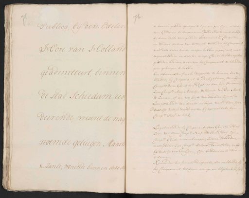 te kennen gevende genegen te zijn om van zijne natela¬ Publicq, bij den Edelen tene Goederen te disponeren, dood ende te niet doende bij dezen alle voorgaande Testamenten, Codicillen en andere actens van uitterste wille, die hij Comparant voor dato dezer zoude mogen hebben gepasseert, niet Hove van Holland tegenstaande in dezelve eenige Clausulen derogaton gevonden wierden, waar van hij Comparant verklaarde geen geheugen te hebben En alvorens, ter finale dispositie te komen, zoo ver geadmitteert binnen klaarde hij Comparant te Praelegateren, aan zijn Compts. Oom Gerrit van Riet en aan zijn Huisvrouw Zijn Compts: Moeij Maritje Willemse Van Der Mark te zamen, of een van beijde vooroverleden zijnde de de stad schiedam res„ Langstlevende van dezelve en beijde vooroverleden zijnde deszelfs wettige descendenten bij repræsentatie, zijn Compts: staande klok deerende present de nae Legateerende hij Comparant aan Gerritje Plooij zoon van zijn Compts: Neef Willem Plooij zijn Compts: Goude mouwknoopjes, zilvere tabakdoos noemde getuigen Maarti mitsgaders zijn Compts: zilvere tandestoken en bij bij deszelfs voor overlijden, zijn broeders en zusters te zamen Komende ter finale dispositie zoo verklaarde hij van Zante, wonende binnen deze sta hij Comparant tot zijne eenige en Algeheele Erf¬