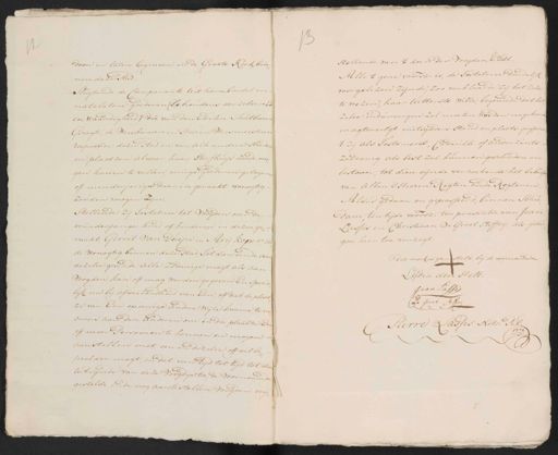doen en laten begraven in de Groote Kerk bin¬ nen deze stad. Sluijtende de Comparante Uit haren boedel en natelatene goederen (behoudens der zelven Ed en waardigheid) die van den Edelen Achtbare Geregte, de Weeskamer en Heeren Weesmeesteren respective dezer stad en van alle andere steede plaatzen alwaar haar sterfhuijs zoude m gen komen te vallen, eenige goederen gelege off minderjarigen daar in geraakt wonagtig zouden mogen zijn. Stellende zij Testatrice tot Voogden over de minderjarige kind off kinderen in dezen ge¬ raakt, Gerrit van Duijn en Arij koper de wonagtig binnen deze stad. Tot dien einde aa dezelve gevende alle zodanige magt als aan Voogden kan off mag werden gegeven En specie lijk om bij afweezendheid van Een, off dat de plaat ze van Een op eenige andere Wijze kwame ter ceren aan den anderen om in die plaatze Ee¬ off meer Persoonen te konnen en mogen aanstellen met een en dezelve off wel be¬ paalder magt, en dat van tijd tot tijdt tot den Uiteijnde van deze Voogdije toe, de voornoemd gestelde ende nog aan te stellen voogden vrij¬ stellende van 't doen der Voogden Eedt Alle 't gene voorsz: is, de Testatrice duidelijk voorgelezen zijnde, zoo verklaarde zij het zelve te wezen haar uitterste wille, begerende dat het zelve indiervoegen zal moeten worden nagekon¬ en agtervolgt mitsgaders stand en plaats grijp 't zij als Testament, Codicille of ander zints zoodanig als best zal kunnen geschieden en bestaan, tot dien eijnde verzoekende het behul¬ van Allen's Heeren Regten ende Regteren Aldus gedaan en gepasseerd, binnen Schie¬ dam, ten tijde voorsz: ten presentie van Jean Lassis en Christiaan De Groot Stiffrij, als getu gen hier toe verzogt dit merk is gestelt bij de voornoemde Lijdia den Helt. Jean Laffis De Groot Stiffry Pierre Lassis Nots: Pul Gt.