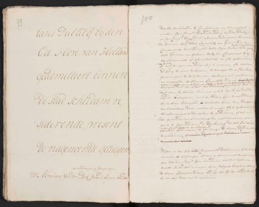 soo dewelke verklaarde te Constitueren en volmagtig te maken zijn Compts: Vader d'Hr: Arnoldus van der Beek taris Publicq bij den en zijn Compts: Oom d'Hr: Maarten Burgwal, beide won urende de binnen deze stad, specialijk om geduij¬ te ad Comparants Uitlandigheid alle zijne zaken te dirigeeren Alle goederen en gelden welk hem Comparant 't zij Ed: Hove van Holland ex Testamento of Ab intestato mogte opkomen en dezelve ^ te ontfangen en onder zig te nemen, ofte dezelve Publicq te doen verkopen, te transporteren, de koop¬ penningen te Ontfangen de koopers te quiteren geadmitteert binnen en ingevalle de Heeren Geconstitueerdens best dagt 't zij ex testamento of ab intestan¬ taat des Boedels ^ twijse lagtig zonden parant Erf ^ Waar in begrepen dat den Heij dat dan zij zullen kunnen Acte van 't Jus delibe¬ randi te passeren, met de verdere Geinteresseerdene bij de Hoge Overigheid te verzoeken brieve van Preneficie de stad schiedam re„ van Inventaris daar omtrent naar Stijle gebruikelij tot interinemente derzelven te procederen, of wel na den geformeerden Inventaris de nalatenschap pro parte te aanvaarden de Reekening die als zal worden siderende present ap:ts Erfportie te ont'jar¬ ^ zijn gemaakt, op te nemen, te sluiten ^ en de Heeren Rendant te quiteeren, of dezelve Reekening te debatte vereisch van zaken Wijders om van alle zijn Comparants debiteuren te vorderen de nagenoemde getuijgen innen en te ontfangen zodanige summens van penni¬ gen als hem Compt: zijn komende uit wat hoofde en Oorzake zulks zoude mogen zijn volgens bewijzen aan ^ meerderjarig Jongman de Heeren Geconstitueerdens van tijd tot tijt ter hande te stel¬ D'H:r Abraham van der Beek wonende binnen deze stad len om zig daar na te reguleeren