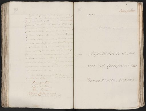 Relat. v. Bulderen No. 183. Hijnde de Comparant te vreeden, zich vri¬ willig in den inhoude en naarkomis dezes, voor de Ed: Mog: Heeren, Gecommitte¬ Raden in Holland, te doen en laten C demneeren, ten dien einde onwederroep Procuratie ad negotia Constitueërende en gevolmachtig mo¬ bij dezen d Hren Nicolaes Daniel Wolffg Rombout Coster, en Willem de Bas, alle cureurs, voor welgem: Hren. Gecomm: Rad. in Holland, te Hamen en ieder van hun in t bijzonder, zoo om de voorsz. Co gegrotjeert Aujourd’hui le 14.e Avril demnatie te verzoeken als om daar te Consenteeren respe., belovende hy rigte uit kragte dezes gedaan, te zul¬ approbeeren onder verband en subjectie 1777, est comparu par¬ als naar recht Aldus gepasseert ten presen¬ van Leendert Palestijn en Arij Smeer als devant moi Me. Pierre Frans van Leeuwen Lt. Palesteijn Arij Smeer Pierre Lassis Nots: Pub: