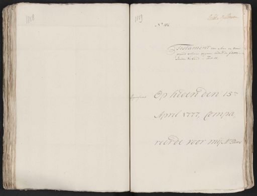 Relat. v. Bulderen 1159 No: 184. Testament van Man en Vrouw gegoed volgens opgave onder de ƒ 2000„- zonden verband art: 51. Gegrosseert. Op heden den 15=e April 1777, Compa¬ reerde voor mij Mr: Pierre
