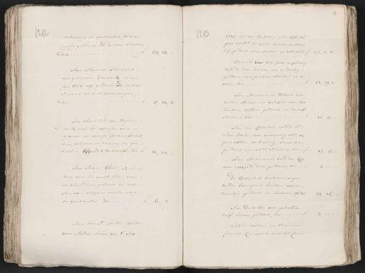 1212 12B 1775, tot den laatsten Mei 1776, vol¬ eekening en quitantie, drie en gens reek:g en quit:e zeeven en twin, tagtig guldens en dertien stuivers, tig guldens eene stuiver en acht penn. ƒ 27„ 1„ 8 83„13„ dus betaalt voor twee jaren verpondin¬ van de twee huizen, een en dertig Aan Thomas Heiligers guldens, neegentien stuivers en 4 voor geleeverd ijzenwerk in den 31. 19. 4. penn: dus Jare 1776 vijf guldens en dertien stuivers en acht penning Aan Secretaris en Bodens voor dus veilen afslaan en verkopen van twee 5.13„8 huizen, vijftien guldens en twaalf stuivers dus. 15 „ 12 Aan Martinus van Wagten¬ Aan den Castelein van de Sr. donk voor het oppassen van Joris Doele voor verteering etca: Wee¬ grauen en eenige gedane verschot¬ gens voorm: verkoping, zeeventien ten volgens reekening en qui¬ guldens en acht stuivers, dus. tantie, Elf guld: & Veertien stver. dus ƒ 11„14„ 17„8„- Aan Hermanus van der Ko¬ voor roepgeld, drie guldens, dus Aan Adam Goudt, Zeilman ken voor het verstellen van de Opsteek of trekpenningen zakken drie guldens en vier van de bovengeme. huizen, waren stuivers volgens reekening twintig guldens en zestien stver, dus ƒ 20„ 16„ ƒ 3„ 4„ en quitantie dus Aan Dirk Bos voor geleeverde turf, zeeven guldens, dus....... Aan het St. Anth: gilde Aan de Notaris en Procureur voor solden huur van 1e. Mei Cornelis Kneppert, voor het Conci¬