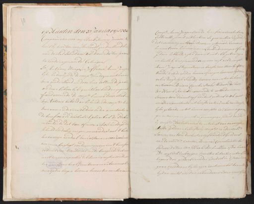 op Huiden den 3=e Januarij 1783 Compareerden voor mij Isaak Penning Junior Vo¬ taris bij den Hove van Hollandt geadmitteerd bij nen de stad schiedam resideerende ter prae„ tie van de nagenoemde Getuigen. Sr. Anthony Huigen en Juffrouw Anna Jurge Egte lieden zynde de compte: in dezen met haare man geadsisteerd en door hem tot ’t meede pass ren dezer behoorlyk geauthoriseerd en gequat ficeerd woonende de compte binnen deeze stad en mij Notaris bekend en bekende de compten. te z men en een ieder in solidum onder renuntiatie de beneficien de duobus vel pluribus reis de be¬ inhoudende dat twee of meer selvs schuldige de schuld verdeelen mogen, en een ieder met ’t bet len van zijn aandeel kan volstaan en voor zoo verre hier in een borgtogt zouden mogen zyn van ’t benefic ordinis seu Excusionis mede brengende dat mij eerst den principaalen debiteur in regten zouden ten aanspreeken Executeeren en uitwinnen Een men op den borgen koomen kan en ten aansien van Compte. Anna Jurgens van de beneficien senatus con¬ sultivelle, aniet authenticae si qua mulier zeggende dat vrouwen zig niet vor anderen, en getrouwde trouwen hun niet voor hunne mannen verbinden mogen of zulks gedaan hebbende egter daar uit niet obligatoir zijn en laastelyk nog van zood eenig voor regt als de compt Anna Jurgens tegensdeeze in kragte van Huwelyks door„ Waarde te stade zouden kunnen of mogen koomen by dezen welen deugdelyk schuldig te wezen aan en ten behoeve van Vrouwe Adriana Cornelia Stocke Weduwe de heer Mr. Isaack Rochussen woonende te rotterdam eene som van twee duizent vyf hondert guldens te xl groot en ieder spruitende uit hoofde en ter zaake van deugde lyke geleende, en tot hunne compten. volkoomen genoe¬ gen ontvangen en genootene penningen afstand doende Zij Compten. derhalven van de uitvlugt van onaangen stelde gelden en beloofde zij compten van de voorsz: somme van twee duisent en vijfhonderd Guldens aan de voorne Vrouwe Adriana, Cornelia Stoeke Weduwe d' Heer Mr. Isaak Rochussem of die haar Ed=e regt zal verkrygen te zullen betaalen intressen tegens drie guldens van ieder hondert in 't Jaar int gaan op heden en by langer continuatie ten allen tyden mits als dan elkanderen zoo in opeissen