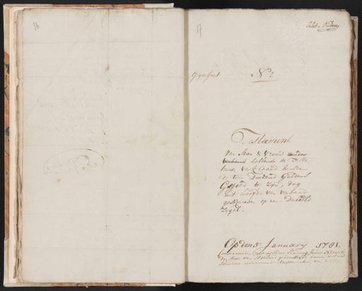 Gegrosseert Relat. v. Buldere N 2 Testament Van Man & Vrouw zoude verband hebbende de Testa teuren verklaard beneden de twee Duizend Guldens Gegoed te zijn, dog uit hoofde van verban geschreeven op een Dubbeld Zegel Op den 5e. January 1781. Compareerden voor mij Isaac Penning Junior Notaris A den Hove van Holland geadmitteerd binnen de stad. Schiedam resideerende ter præsentie van de