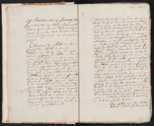 Op Huiden den 2=en Januarij 170 Compareerden voor mij Isaac Penning a Notaris bij den Hove van Holland gead¬ teerd, binnen de stad schiedam resi¬ rende ter præsentie van de nagenoem¬ getuijgen Abraham den Heldt ter Eenre Cornelis den Heldt ter tweeder en Frans de Kock als in huwelijk hebbende Maria den Heldt en dezel¬ Maria den Helt met haaren gemelde man geadsisteert en door hem tot het te nen en passeeren dezer behoorlijk geauthor seert en gequalificeert ter derder zyde woonende de comparanten alle binnen deze stad en mij Notaris bekend Te kennen geevende dat huijcompt Mij Zusanna Witseld in leven weduwe van Gerrit den Heldt gewoond hebbend en den 30 October van dezen voorleeden Jaaren 1781 binnen deze stad overtee¬ derzelver Testamentaire disposit den 23 April 1773 voor den No Pieter Nuysink en getuigen alhier ge¬ seert de Compn. tot haare eenige universeelen Erfgenaamen hadde ge mineert & geinstitueert. Relat. Bulderen Dat op het overlyden van hunne voorn Moeder de Comp:n vermits de goede verstand houding onder malkanderen Onnodig had den geoordeelt de Heer Jacobus Cas Garder koornwynbrender en Jacobus de wet beiden woonende alhier, welke bij het voorsz: Testament tot Executeurs waren gesteld interoepen, en zij alle meerderjarig zynde geen voogden te passe kwamen, ook onnodig hadden gevordeelt het maken van eenige spe eificque staat en Inventaris maar dat Zij hunne gemelde moeder ter aarde be¬ steld hebbende vervolgens te zamen haar nagelaten boedel hadden gered en gebragt tot Liquiditeit en voorts haare nagelaa¬ tene laste goederen als mede de Contante Penningen, meubilen en huiscieraaden, goud en zilver en dus den gezeelen Boedel nietwee uitgezondert onder malkanderen in alle min en vriendschap hadden geschift, gescheijd en verdeelt, onnodig zijnde alle het zelve alhier spoeificq te melden, ofte daar van een breder verhaal te doen, Edog op dat ten opzigte van de Stuizen en Erven in tijden en wijlen een yder eijgendom zoude kunnen worden beweezen zo verklaarde zij compn. dat bij die haare gedaane schiftinge, scheyding en verdeeling is te beurt gevallen te weeten Aan Abraham den Helt en werd mitsdien bij dezen aan hen