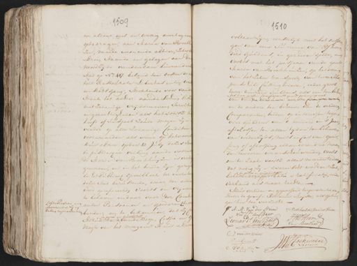 of de Persoon rende dezen represen 1509 en aldaar wel en wettig overtegeeven op te dragen aan Maria van Broekh zen, meede woonende alhier, zeker sij & Erve, staande en gelegen aan de noordzijde vandendam binnen deese stad op N„o 417. belend ten Oosten de s heit Restaurata Libertas enten wel een stads gang, strekkende voor vande swaate tot achter aan de schie; En zo met zodanige vrijdommen, vervit en gerechtigheden als het voorsz: h heeft of subject zoude mogen zijn verder op alle zodanige Conditien voorwaarden als waar op het voorsz Huis & Erve op den 12 Julij dezes Jaar in publiecque veiling aande voorn de Maria van Broekhuijzen is verko geworden, en in het breede zijn gereg in het Publieck opveilboek ter secreta dezer Stad berustende waar toe alhier word gezefereerd; voorts om vrij war te beloven en daar voor der Consti¬ anten Persoonen en goederen, te binden, en te bekennen, dat zij in privé en stituanten aan de koop, Cessie en dragte van het meergem.e Huis & Erve 1510 voldaan zijn, eerstelijk met het ontfan¬ gen van eene summa van Elfhou derd guldens, in gereeden gelde, en voorts met het passeren vande geme. Maria van Broekhuizen, op het doen van het zelve transport, van twee sche¬ penschuld Custing brieven ieder groot twee duizend guldens, als een ten behoe des heer eersten Comparemts geme. principa ven van de Vrouwe eerste Comparanten en de andere ten behoeve van de verdere Comparanten, beiden op interessen tegen vier Guldens van 't honderd in t Jaar aftelossen ten allen tijden ten believen van wederzijds, mits in Cas van opeis¬ sing of aflossing elkanderendrie maan den tevooren waarschouwende; voorts om ter zaake voorsz: alles meerder te doen dat nodig zijn & vereischt worden zal; in privé en belovende approbatie & ratificatie, onder verband als naar rechten Aldus verleden en gepasseerd ter præsentie van lk Pieter de Graaf & Adrianus Meijster, als getui¬ gen hier toe verzocht. Pr. A: M: Van der Heim J: Bosschaertwed Jander Heim Wed. J. den Beer J:W:D:Heim Leonard: den Beer Van Baarland C. J. van der Heim de Greaff Soekwater Ao. Meijster Notaris