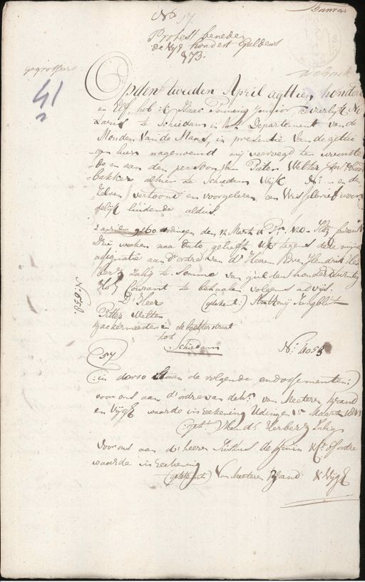 Bauver No 17 Protest beneden de Vyf hondert Guldens 1873. gegrosseert D.r Bosch Op den tweeden April agttien honderd en Elf, heb ik Isaac Penning Junior, keizerlyk Ni¬ taris te schiedam in het Departement van de Monden Van de Maas, in presentie van de getui¬ gen hier nagenoemd mij vervoegd ten woonste de en aan den persoon van Pieter Welter mr: brood bakker alhier te Schieden Wijk No: en den zelven vertoond en voorgelezen een Wisselbrief woor¬ delijk luidende aldus. 2 april 1260 wodingen den 12 Maert 17 Pr. ƒ120 - Hr. bekent Drie weeken naa dato, gelieft UE tegens deze mijnen assignatie aan d'ordre van de Heeren Erven Hendrik He¬ berz zulig te somme van gulden honderd twintig te Hof Courant te betaalen volgens advijs. D' Heer (getekent:) Anthonij Jungblut Pitter Welten zackermeester in de boetterstraat tot Schiedam No: 4055 57 (:in dorso staan de volgende endossementeni¬ voor ons aan d'ordre van dehr: van Mecteren Srand en Vijgh waarde in reekening Udingen 15 Maart 1811 Gett: Hendk: Herberg salig voor ons aan d' heeren Sussus de syn in & Co. of ordre waarde in reekening (getekent) Van Meeteren Band: & Vijgh