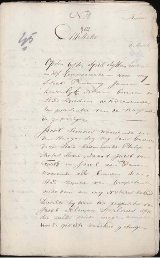 N. 14 Bauwer ƒ 82. Attestatie 10 de Bosch Op den vyfden April Agttien hondert en Elf Compareerden voor my Haac Penning Junior Keizerlyk Notaris binnen de Stad Schiedam resideerende ter præsentie van de nagenoemd de getuigen Jacob Simons woonende in den Haage dog zig tans binnen deze stad bevindende Philip Moses Levie, Davod Jacob van Furth en Jacob van Dam woonende alle binnen deze Stad zynde van Competenten ouderdom en mij Notaris bekend Dewelke by dezen ter requisitie van Jacob Salomon Saarlouis ofte die zulks zoude mogen aangaan voor de oprechte waarheid getuigen