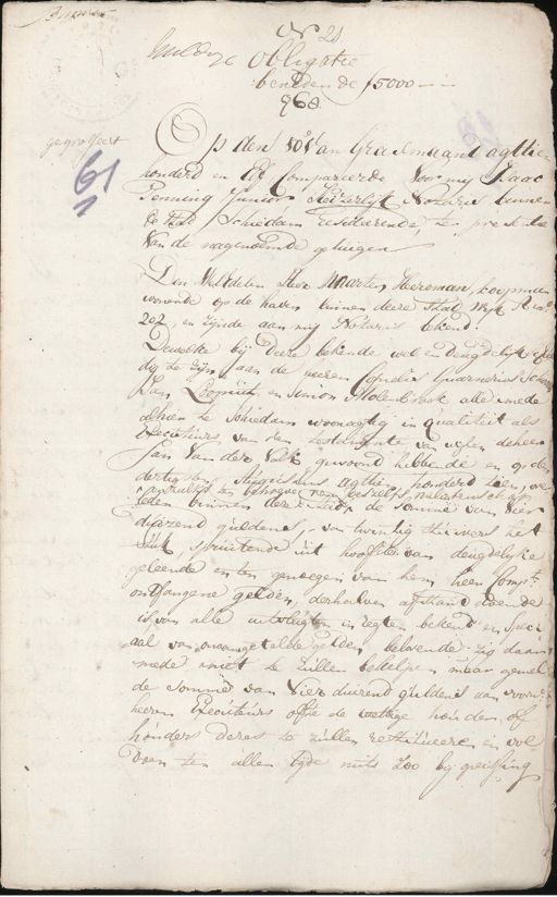 Bauwer No. 21. Milder 26 obligatie beneden de ƒ 5000 - 1768. gegrosseert Op den 10e van Grasmaand agttie honderd en Elf, Compareerde Voor mij Isaac Tenning Junior Keizerlijk Notaris binnen de stad Schiedam resideerende, ter presentie van de nagenoemde getuigen Den WelEdelen Heer Maarten Heereman, koopman wonende op de haven binnen deeze stad wyk A in't 202, en zijnde aan mij Notaris bekend! Dewelke bij deeze bekende wel en deugdelijke schae¬ dig te zijn aan de heeren Cornelis Guarnerius Schou¬ Jan Loopuit en Simon Molenbroek alle mede alhier te Schiedam woonagtig in qualiteit als Executeurs van den testamente van wijlen de heer Jan Van der Volk gewoond hebbende en op den dertigsten Augus Uns agttien honderd tien, over ^ en zulks ten behoeve van deszelfs nalatenschap leden binnen deze Stad ^ de Somme van Vier duizend guldens, van twintig stuivers het Stuk, spruitende uit hoofde van deugdelyke geleende en ten genoegen van hem heen Compts. ontfangene gelden, derhalven afstand doende is, van alle uitvlugten in regten bekend en speci¬ aal van onaangetelde gelden belovende zig daar mede niet te zullen behelpen maar gemel de somme van Vier duizend guldens aan voorne. heeren Executeurs ofte de wettige houder of houders dezes te zullen restitueeren en vol¬ doen ten allen tijde mits zoo bij greissing