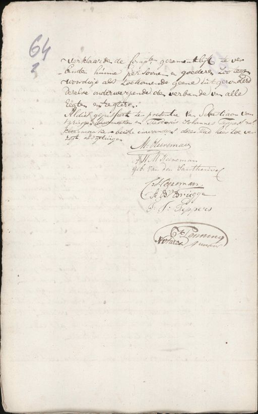 verklaarden de Compten. gezamentlijk te ver¬ binden hunne persoonen en goederen zoo tegen woordige als toekomende geene uitgezonderd deselve onderwerpende den verbande van alle regten en regteren. Aldus gepasseert ter presentie van Sebastiaan van zruggen scheefmeesten en Theodorus Johannes Tepper mr. kleermaaker beide inwoonders dezer stad hier toe ver¬ zogt als getuigen M: Heereman A H M Heereman geb: van den Santheinel J. Heereman E.A.V.Brugge J: J: Fepper F. Penning Notaris Junius