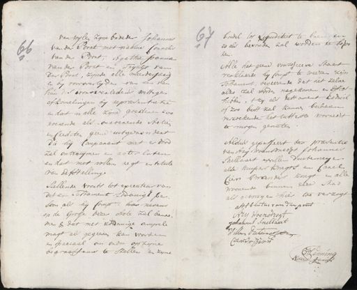 van wylen zyne broeder Johannes van der Poort met naame Cornelis 66 van de Poort, Agathie Joanna van der Poort en Tryntje van der Poort, zynde alle meerderjarig en by vooroverlyden van een van hun des woroverledens wettigen afkomelingen by repræsentatie en dat in alle zijne goederen zoo roerende als onroeren de Actien en Crediten geene uitgezondert. die hij Comparant met er dood Zal ontruijmen en agter laten en dat met vollen regt en titule van Erfstelling Stellende voorts tot executeur van dit zijn Testament zodanigh per Loon als hij Compt: hier nevens op de Grosse dezer Acte zal benoe¬ men & dat met zodanige ampele magt als gegeeven kan worden en speciaal om ordre op zijne begraeffenis te stellen en zyne boedel tot Liquiditeit te brengen 6 zo als bevonden zal worden te behoo¬ ken. Alle het geene voorschreeve Staet verklaarde hy Compt. te weezen zijn Testament, begeerende dat het zelve alzo zal worden nagekomen en Effect- hebben, 't zy als testament codicil of zoo best zal kunnen bekaan verzoekende het uitterste worrecht te mogen genieten. Aldus gepasseert ter praesentie van dry woensdrecht Johannes Shellaart Willem duitemeyer alle huijpers knegts en Carel Cieri Branders knegt en alle woonende binnen deze Stad als getuigen hier toe verzogt Albentus van den poort Ary Woensdregt Johannis Snellaart Willem Deutircof Cardenzins F. Lenning Notaris Juris