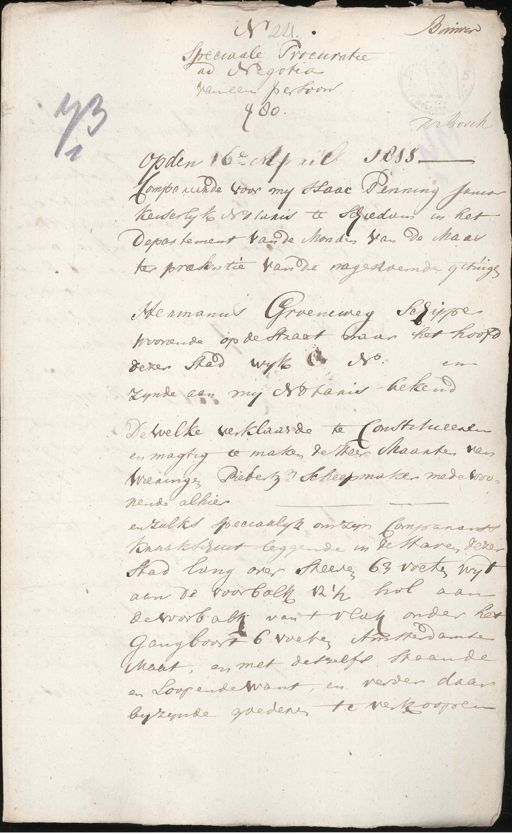 Bouwer No 24. speciaale Procuratie ad Negotia van een persoon 480. de „der Bosch 11 Op den 16e April 1811 — Compareerde voor mij Haac Penning Janco Keiserlyk Notaris te Schiedom in het departement van de monden van de Maas ter præsentie van de nagenoemde getuigen Hermanus Groeneweg Schipper woonende op de straat naar het hoofd dezer stad wyk No. en zynde aan mij Notaris bekend De welke verklaarde te constitueeren en magtig te maken de Heer Maarten van Wieringen Pietersz Scheepmaker mede woo¬ nende alhier. en zulks speciaalyk om zyn Comparante kraakschuit leggende in de staven dezer Stad lang over steeven 63 voeten wyt aan de voorbalk 12½ hol aan de voorbalk van 't vlak onder het gangboort 6 voeten Amsterdamse Maat, en met deszelfs staande en loopende want, en verder daar by zynde goederen te verkoopen