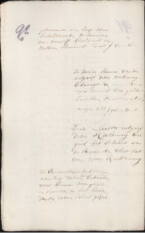 geduurende den loop dezer 9 boedelszaaken de somme van twaelf Guldens en zestien stuivers. dus ƒ 12 - 16 De tweede Somma van den Uitgaef dezer reekening bedraagt de somme van negen honderd twee guldens Zeventien stuivers en agt pen ningen dus f 902-17-8. Derde enlaatste uitgaaf dezer Reekening wee gens het Salaris van de Rendanten & het fat coen dezer Reekening De Rendante zoude hebben aanzig zelven betaalden voor hunne moeytens en recatien in het bered den van dezen boedel gehad