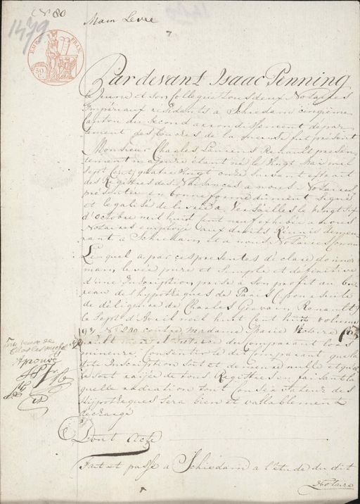 No 89 Main Levee Pardevant Isaac Penning le Jeune et son Colleque tous deux Notaires Impériaux residants a Schiedam cingième Canton du second arrondissement, de par¬ tement des bouches de la meuse fut present Monsieur Charles Laurens Result presen¬ tement majeure étant ne le Vingt Mai mil Sept Cent quatre Vingt onze Suivant extract des Registres des Naisances a nous Notaires présentée en bonne forme dument signé et legalisé delivree a Versailles le Vingt Six d'octobre mil huit Cent neuf exhibeé à nous Notaires emploije aux droits Réunis, demeu¬ rant a Schiedam et a nous Notaires Connu¬ Le quel a par ces presentes de clare donner main levée pure et simple et definitive d'une Inscription prise a son profit an bu¬ reau des hypotheques de Paris (: poursuite de deligence de Charles Gervain Renaultij le Sept d'Avril, mil huit Cent huit. volume 97 No. 240 contre Madame Marie Victoire Ch nte veuve den mault mere et Testrice du Comparant lors Charles Michel mineure consentir le dit comparant que la Aprouve dite Inscription soit et demeure nulle et qu'el¬ APJr. le soit raijée de tous Registres en faisant la 1641 quelle radiation tout conservateur des Le et Hijpotheques sera bien et vallablement decharge Dont Acte Fait et passe a Schiedam a l'étude du dit Notaire