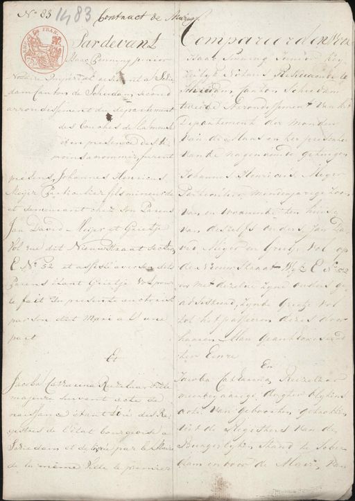 No. 83 14 83 Contract de Maragh Compareerden voor Pardevant Isaac Penning Junior Keys Haac Penning junior zerlyk Notaris Resideerende te Notaire Impérial resident a Schie¬ Schiedam Canton Schiedam dam Canton de Schiedam second tweede Arrondissement van het arrondissement du departement Departement der monden des bouches de la meuse van de Maas en ter presentie et en presence des té¬ van de nagenoemde getuigen moins a nommer, furent Johannes Henricus Meyer presens Johannes Henricus Meijer Particulier fils mineur de Particulier minderjarige zoon et demeurant chez son Parens van en woonende ten huis Jan David Meijer et Grietje van deszelfs ouders Jan Da vid Meijer en Grietje Vol op Vol ene dit Nieuwstraat sectio E No. 52 et assisté avec son dits de Nieuwstraat Wyk E No 52 Parens étant Grietje Volpou en met dezelve zyne ouders ge¬ le fait du presente auctorisé adsisteerd, zynde Grietje vol par son dit Mari a l'une tot het passeeren dezes door part haaren Man geauthoriseerd ter Eenre Et En Jawba Catharina Reezelaar Jacoba Catharina Reezelaar Fille meenden aarige dogter blykens majeure Suivant acte de acte van geboorten getrokken naissance étant stre des Re¬ uit de Registers van de gistres de l'état bourgeoise a Burgerlijken stand te schien Schiedam et delivrée par le Maira dam en door de Mairen van de la meme Ville le premier Monsieur M r de