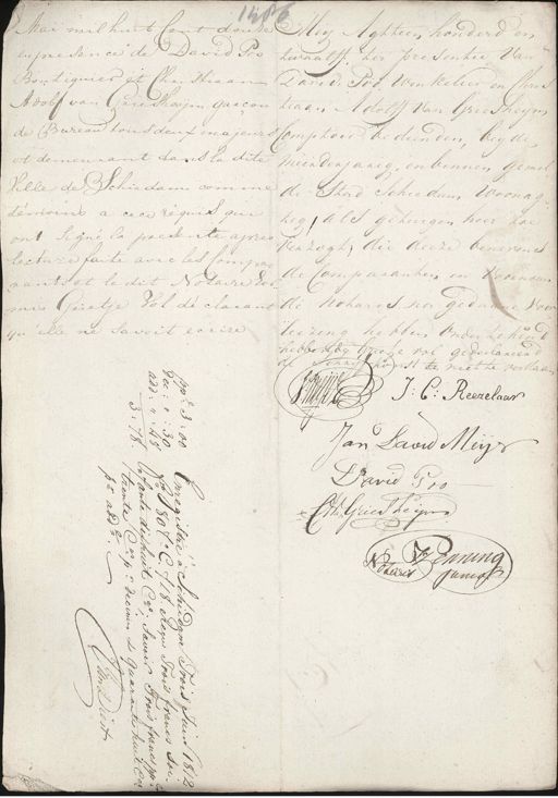 140 Mai mil huit Cent douze Meij Agttien honderd en en presence de David Poo twaalff ter presentie van Boutiquier et Christiaan David: Poo, Winkelier en Chris¬ Adolf van Griesheijm garcon tiaan Adolff van Griesheym de Bureau tous deux majeurs Comptoir bedienden, beyde et demeurant dans la dite meerderjarig, en binnen gemel¬ Ville de Schiedam comme de stad schiedam woonag¬ témoins a cecé requis qui tig, als getuigen hier toe ont signé la presente apres verzogt, die deeze benevens lecture faite avec les Compa¬ de Comparanten en voornoem¬ rants et le dit Notaire hor¬ mis Grietje Vol de clarant de Notaris na gedaane voor qu'elle ne savoit ecrire leezing hebben ondertekend hebbende Griete vol gedeclareerd schryf konst te niet te verklaa¬ De de I:C: Reezelaar Witsen Jan David Meijs David Poos Wm. GrievPheijn Henning Pieter Januar 2. De