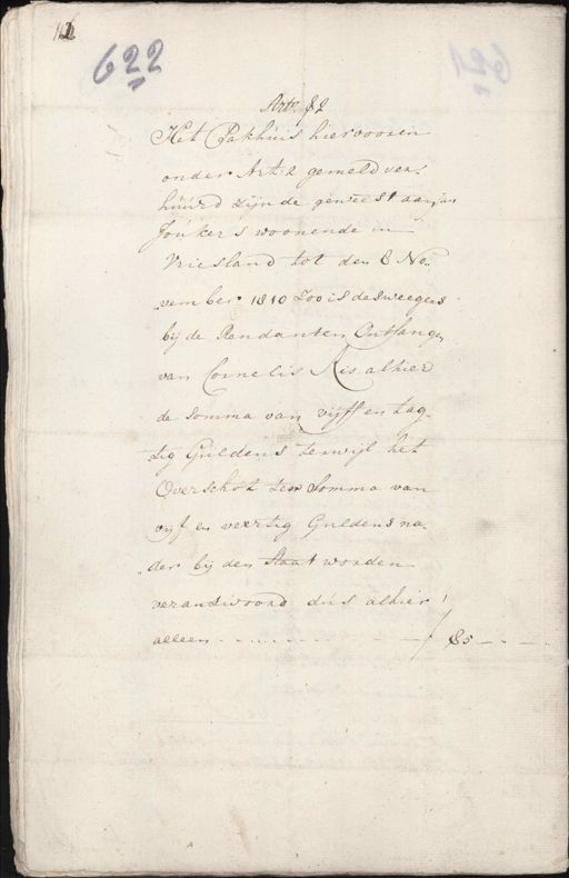 112 22 Artr. ƒ2 Het Pakhuis hier vooren onder Art: 2 gemeld ver¬ huurd zijnde geweest aan Jan Jonkers woonende in Vriesland tot den 8 No¬ vember 1810 zoo is des weegers bij de Rendanten Ontfangen van Cornelis Ris alhier de somma van vijff en tag tig Guldens terwijl het Overschot ter somma van vijf en veertig Guldens na¬ der bij den Staat worden verantwoord dus alhier, ƒ 45-„ alleen