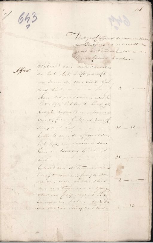 127 543 Uitgaaf tegens de voorenstaan de Ontfang en wel eerst we¬ gens de doodschulden en begraaffenis kosten betaald aan zeeker persoon Affran. die het Lijk heeft gevischt. een somma van vier Gul¬ 4 - „ dens dus. - Aan Zes persoonen welke het lijk hebben 't huis ge¬ bragt betaald een somma van vijftien Guldens twaalf 15 - 12 stuijvers dus betaald aan de afleggers van het lijk een somma van Een en twintig Guldens 21 - dus. betaald aan de Timmermans knegt voor een fooij de som¬ - 2 - „ ma van twee guldens dus aan een Timmermansjongen voor een Corij wegens het brengen en halen der Schra¬ 13 gen dertien stuijvers dus -