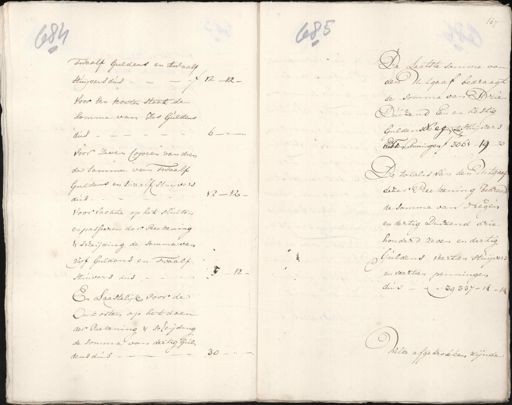 1 Twaalf Guldens en twaalf -f 12-12- Stuijvers dus Voor den korten staat de Somma van Zes Guldens du 8. voor zeven Copien van dien de somma van Twaalf. Guldens en twaalf stuyvers 12 - 12 dus. Voor Sacatie op het sluiten en passeeren der Reekening & scheijding de somma van vijf Guldens en Twaalf 5 - 12 - Stuivers dus En Laastelijk voor de Onkosten op het doen der Reekening & scheijding de somma van dertig Gul¬ 30 dens dus 167 6e De Laatste somme van den ditgaaf bedraagt de somma van Drie Duizend Een en zestig Guldens Neegen stuijvers Erkten Penningen ƒ 3061-19-10 De totalis van den Uitgaaf dezer Reekening bedraagd de somma van Negen en dertig Duizend drie honderd zeven en dertig Guldens veertien stuijvers en veertien penningen dus d. 39 337-14-14 Wilke afgetrokken zijnde