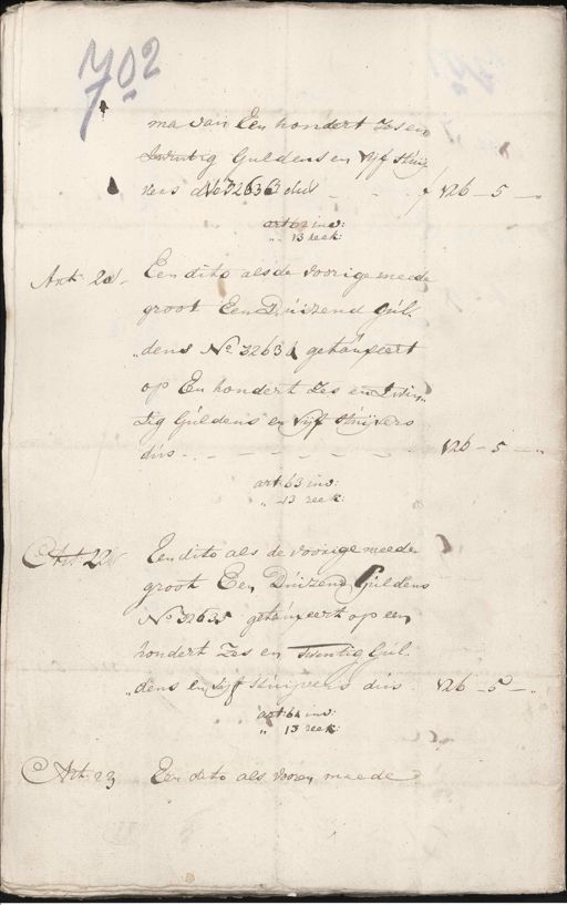 19 ma van Een hondert zes en twintig Guldens en vijf stuij¬ vers de 32636 dus ƒ 126-5 art 62 in V: „ - 13 reek: Een dito als de voorige meede Art. 20. groot Een Duizend Gul¬ dens No. 32634 getauxeert op Een hondert zes en twin¬ tig Guldens en vijf stuijvers 126 - 5 dies - art: 63 in v: „ - 13 reek: Een dito als de voorige meede L tit: 22 groot Een Duizend Guldens No. 32635 getauxeert op een hondert Zes en Twintig Gul. dens en vijf stuijvers dus 126 - 57 art: 64 inv: „ 13 reek. Art. 13 Een dito als vooren meede