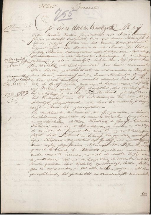 No 205 Procuratie Vandest Op den drie en twintigste Meij agttien honderd veertien, Compareerden voor Isaac Penning Junior en deszelfs Amtgenoot, beide openbaare Notarissen te Schiedam, vyfde Canton van het tweede Arrondissement Departement der Monden van de Maas; De Heer Casper Bouwer Ontvanger van agterstalligen oude Belastingen te Schiedam en der Indirecte Belastingen te schiedam vander Valk en dezelve Juffrouw voornoemd., als in huwelijk hebbende Mejufvrouw Anna ^ Van der Valk, de laatstgemelde voor haare voornoemde Anna Man hiertoe geauthoriseert, en als moeder en Voogdesen over haaren minders aarigen Zoon Nicolaas ^ de Graaff x Mangerethus goedgekeurd in haar eerste huwelijk verwekt door de Heer Jan Dieder rik de Graaf, zijnde voornoemde haare man bij Tro¬ C:B: N: V:D:V ces-Verbaal op den Elfden Augustus des voorleeden Jaars bij raadpleeging van de Famille Raad, gehouden, voor T.R.F.P. het Vredegeregt den Stad Schiedam, en ten zelven dage¬ in behoorlijk geregistreerd aan haar tot medevoogd toegen voegd en door hem geaccepteerd. — En verklaarden de voornoemde Comparanten, in hunne voorschreeven qualiteit bij deeze te verzoeken, Compteere en aantestellen de Heer Nicolaas de Graaf, Openbaar Notaris, wonende te Utrecht, om in naamen en van wegen de voornoemde Comparanten en in hunnen voorschreeve qua liteit het Intrest en belang van gemelde minderja digen Nicolaas Margeretus de Graaf als mede Erfgeraat Van wijlen Mejufvrouw Adriaen van 'S Gravenweerd gewoond hebbende te Utrecht en aldaar overleeden verder waar te neemen, en niet de mede Erfgenaam te procedeeren tot de verkoop van de roerende en onwe „kende goederen des boedels, op zodanige lasten, bedin¬ gen en voorwaarden, en tot alle zulke prijzen, als den geconstitueerde het geschikts en voordeeligst zal oordeelen ten