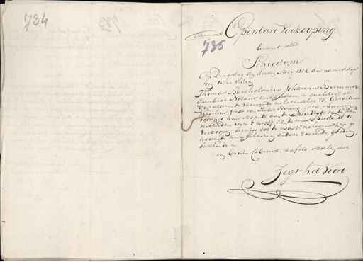 34 Openbare Verkooping Vom dort binnen de Stad Schiedam Op Dingsdag den derden Mey 1814, des namiddags ten twee uuren Thomas Bartholomeus Johannes Bremmer Openbaar Notaris te Schiedam in qualiteit als Curator in de vacerende nalatenschap van Gerardina Vergilius, wede. van Pieter Honing, is van meening voor het huisstaande aan de Noindryde van den Dam te Schieden wyk E n.o 127, aan de meest biedende ter verkoopen, eenige tot de voorsz: naketenschap ge hoorende men bilaire en andere roerende goederen bestaande in: een bruin Cabinet, tafels stoelen etc. Zegt het Voort E