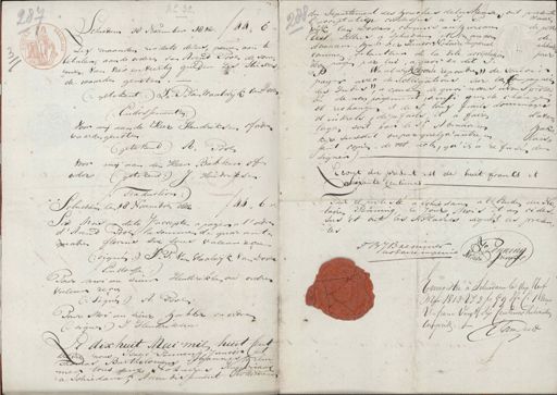 No. 32. ont presenté du Departement des Bouches de la Meuse Weil l'acceptation cidessus a I. P. wijk van Doorn, commis autzwiean de poste Schiedam 18 November 1812 ƒ 44„ 6 „ Ces Lettres a Schiedam et ce au nom de Abraham Bak &co Junior Notaire Imperial a schiedel Zes maanden nadato dezes, nemen aan te comme retanteur de la dite acceptation paer betalen, aan de ordere van Arend Soven de Som¬ être payés par lui, a quoi le dit I. men van vier en veertig gulden zes stuivers Waal wijk voorne reponden" de vouloir P payer avec de sobligations sur les Compagnies de waarde genoten. des Indes", a cause de quoi nous avons protes¬ getekent:) J„ S„ Van Waalwijk van Doorn te de non payement jainsi que de change et rechange, et de S. tous frails dommages Endossementen d'avan et interets deja faits il a faire tage soit par le Sr: Abraham Voor mij aan de Heer Hendriksen of ordre Bak ker susdit ou par quelqu'autre, en waarde genoten. lais¬ sant copies de cet acte, qu'ils a refusé des (:getekend:) A„ Pool signer) - voor mij aan den Heer Bakker of Lecout du present est de huit francs et order (: getekend:) J: Hendriksen Saloixante Centimes Fraduction: Tait et protesté a Schiedam alt Einde du No¬ f 44 6 x Schiedam le 18 Novembre 1812 Penning, le jour mois et an cider¬ taire sus et ont les Notaires signés les presen¬ Sir Mois a dato J'accepte a payer al' ordre tes d' Arend Pooer la somme de quar ante quatres florins six sous valeur eçu T. B. J. Bremmer notaire impériat Notaire Junior J. Zeijning (. signen:) J.V. Van Waalwijk van Doorn (: Endosse:) Pour moi au sieur Hendrikse ou ordres Enregistré à Schiedam le dix Neuf Valeur recis. Mai 1813 V3 2 fo 59 Re C. 1 reçu (: signé:) A: Pool Unfrau Vingt Six Centimes subvention Pour Moi au sieur Bakker ou ordre C piquer:) I Hendriksen comprise Cram Piest Le dixhuit Mai mil huit Cent terize nous Isaac Penning Junior Cet Thomas Bartholomeus Johannes Brem¬ mer tous deux Notaires Imperiaux a Schiedam, Arrondissement Rotterdam
