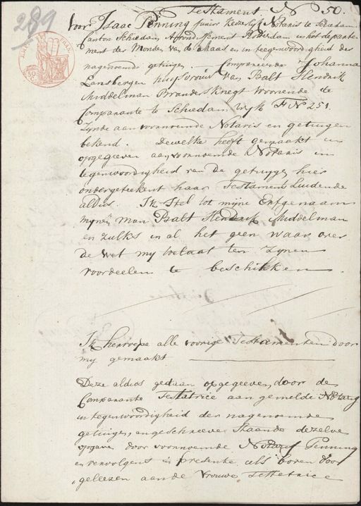 7 350. Testament. Is Voor Isaac Penning Junior Keizerlyk Notaris te Schiedam Canton Schieden Arrondissement Rotterdam in het departe ment der monden van de Maas en in teegenwoordigheid den Compareerde Johanna nagenoemde getuigen Lansbergen huijsvrouw van Balt Hendrik Middelman Branders Knegt woonende te Comparante te Schiedam wyk F No 251. sijn zynde aan woonoemde Notaris en getuigen Dewelke heeft gemaakt en bekend. opgegeeven aan voornoemde Notaris in tegenwoordigheid van de getuijgen hier ondergeteekent haar Testaments luidende aldus. Ik stel tot mijne Erfgenaam mynen man Balt Hendrik Middelman en zulks in al het geen waar over de wet my toelaat ten zynen voordeelen te beschikken Ik herroepe alle voorige Testamenten door my gemaakt Deze aldus gedaan opgegeeven door de Comparante Testatrice aan gemelde Notaris in tegenwoordigheid der nagenoemde getuigen, en geschreeve staande dezelve opgave door voornoemde Notaris Penning en vervolgens in presentie als boven door geleezen aan de Vrouwe Testatrice o